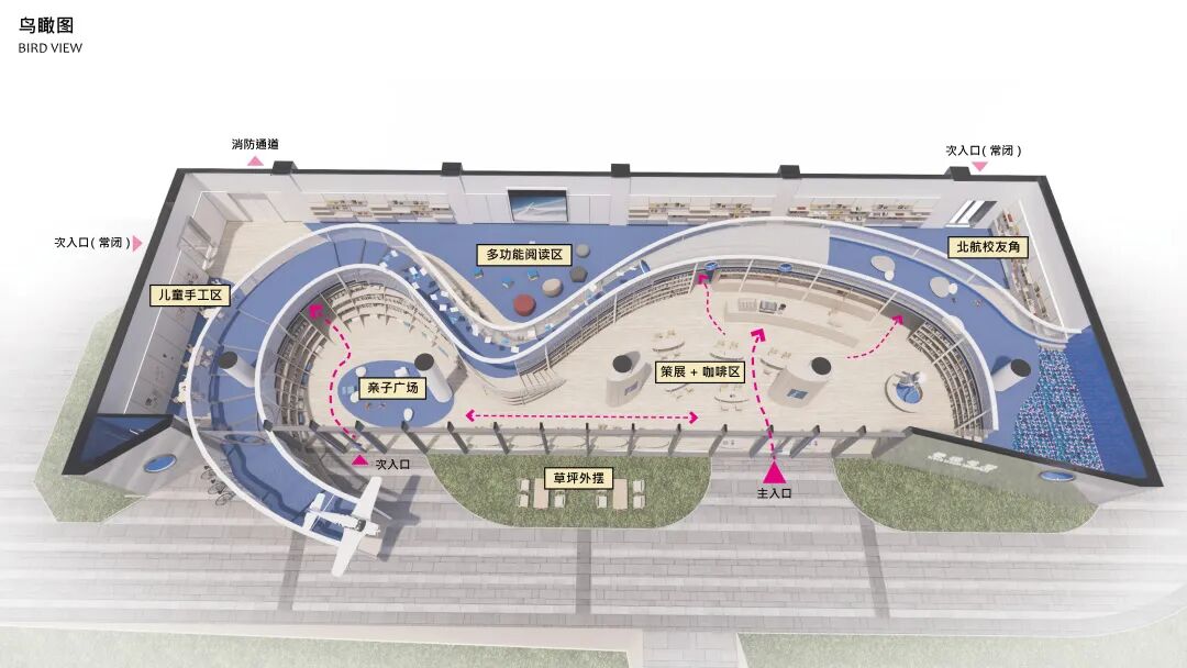 我们以一个抽象的概念开始,飞机飞过留下的一道航迹云,是孩子们触碰航天梦的云梯。落实到空间中,我们做了一个蜿蜒的书架装置,书架上方是儿童使用的云梯廊道。云梯把空间分成前后区,前区公共性更强,包含亲子广场和展览咖啡区。后区相对安静私密,包含儿童手工区、多功能阅读区和北航校友角等。