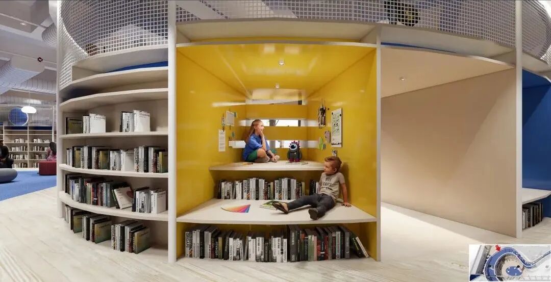 第三个区域是儿童活动区,在这个区域中,孩子们可以充分放电消耗精力,也可以安静地学习。我们在之前的项目中发现,小朋友往往喜欢可以自由组合的座位形式。所以我们设置了可灵活收纳的矮凳在书架下方,同时书架的第一层也可以作为座位使用。