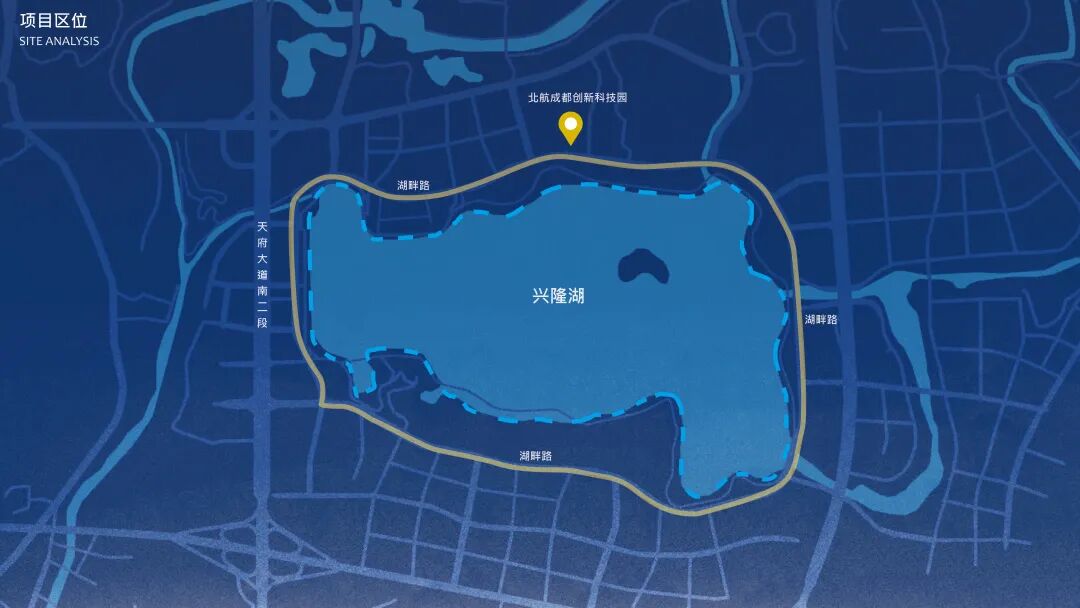 本项目位于成都天府新区兴隆湖北侧,朝南面湖。该个区位有三个特征:1. 兴隆湖生态条件优越,人气旺,成都人周末都爱去。2.潮汐式人流特征明显,周末和周中客群主体不同。3. 在交通工具上,除了步行和车行,环湖的骑行人群也是一个大类群体。