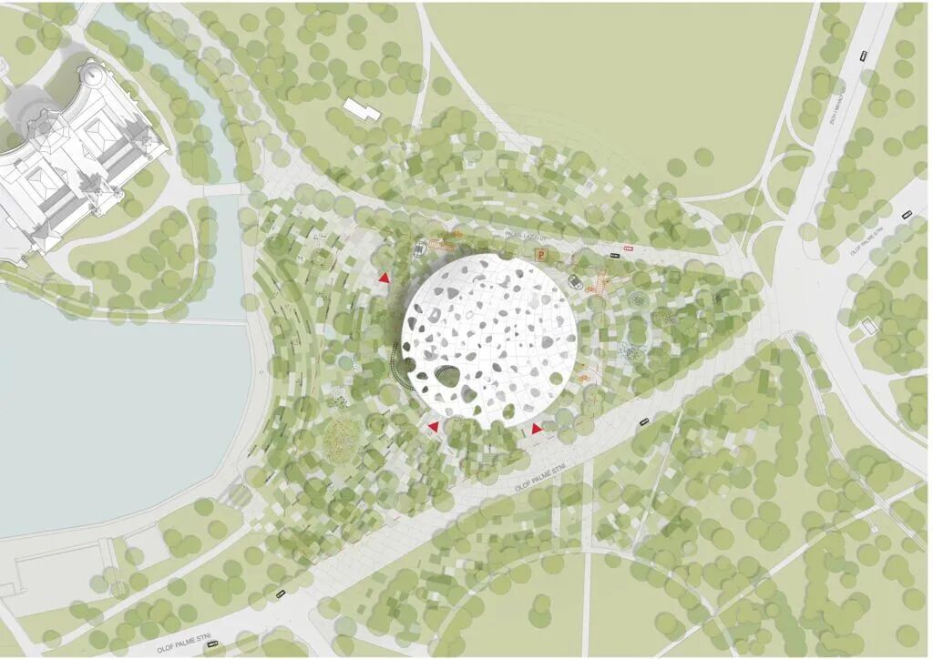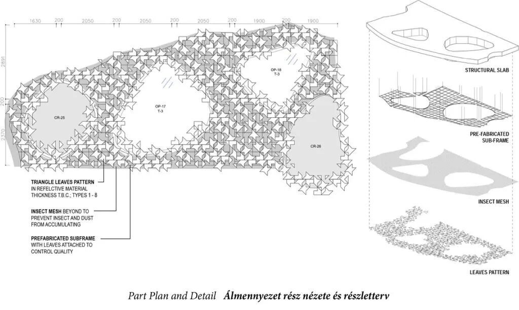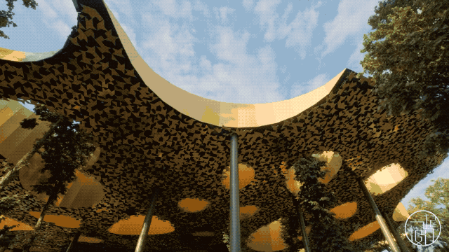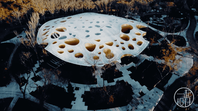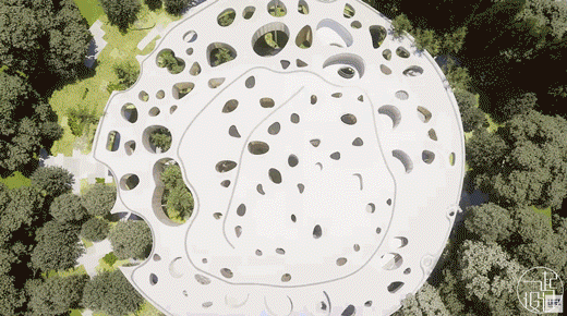 树木可以透过部分孔洞继续在建筑内部生长,阳光穿过孔洞,温暖室内。
