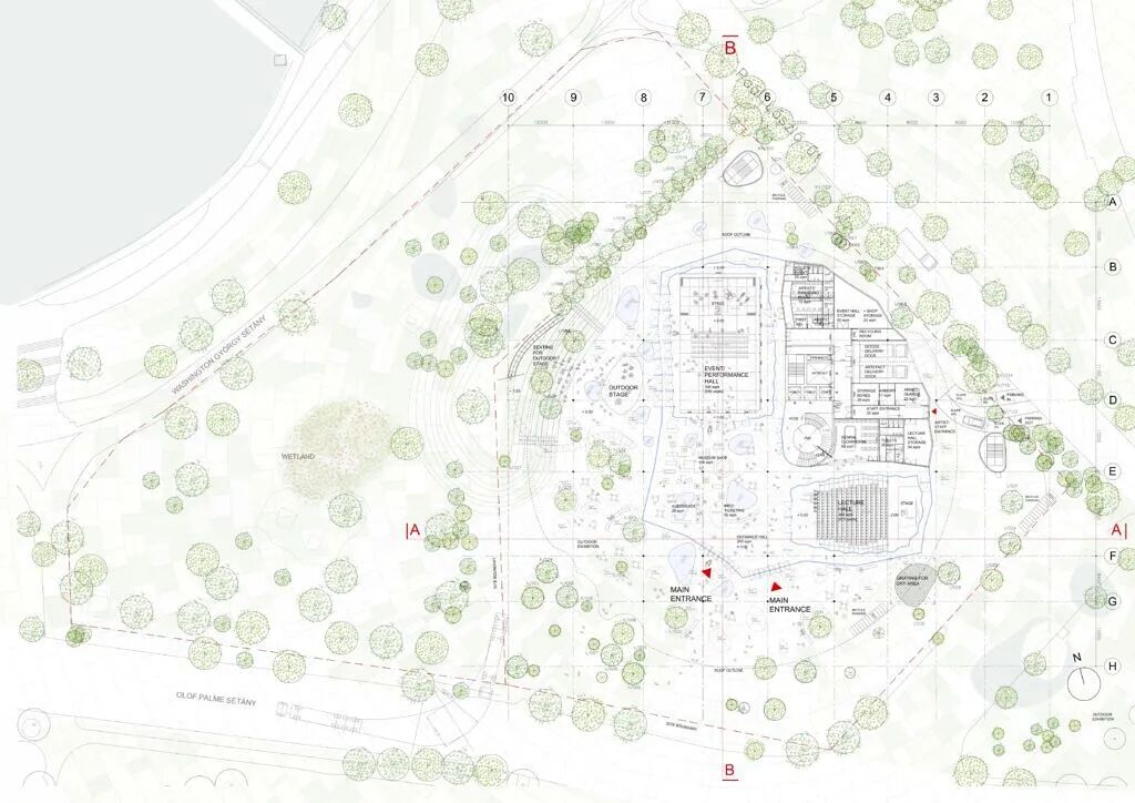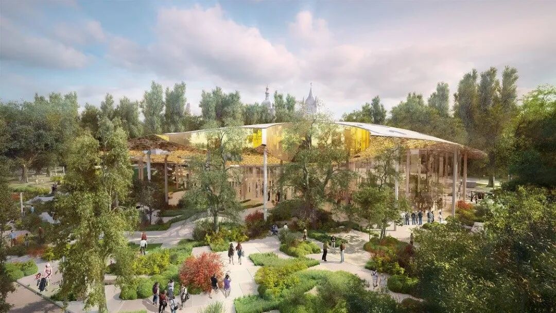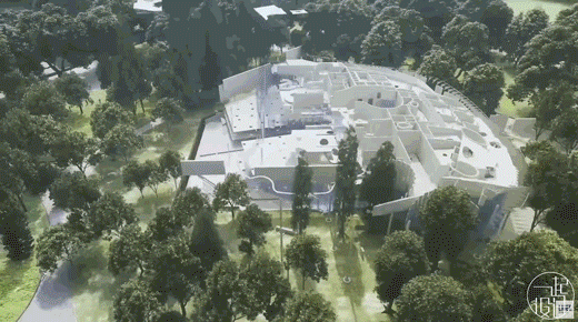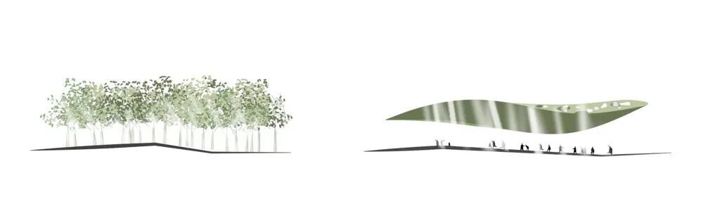 高低不一的起伏屋顶始终将高度保持在树冠之下,确保建筑与环境的融合。
