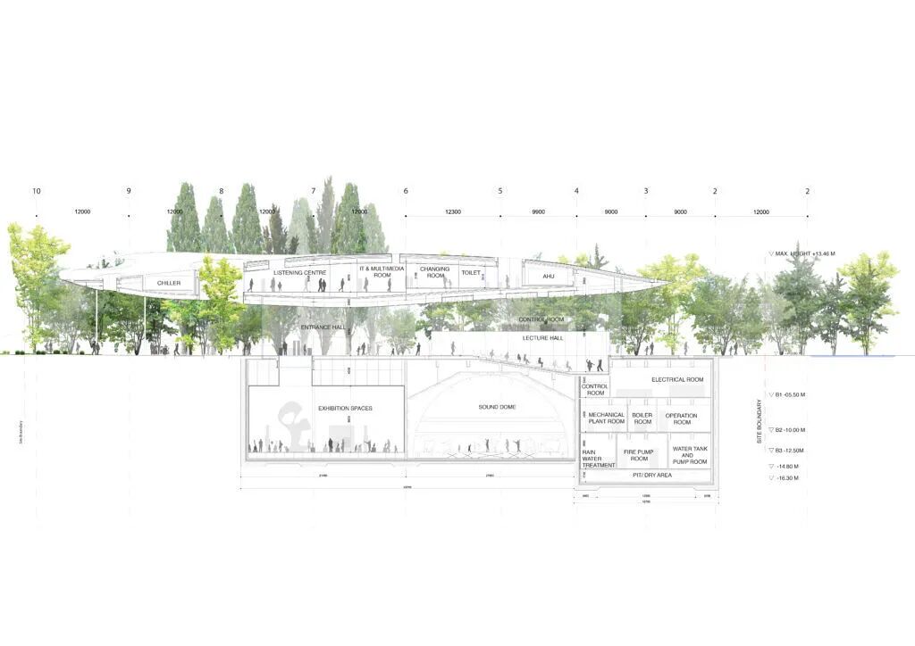 地下室层将用于举办各类永久性和临时性的展览,其中有一个半球形的穹顶,将通过音频和投影技术创建各种“声音空间”,这种互动式的展览让观众更好的了解音乐历史。