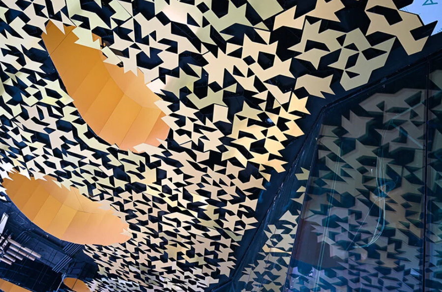 透明的玻璃幕墙也是一大特色,玻璃立面由 94 块定制的隔热板组成,最高的玻璃幕墙高度达到近 12 米。