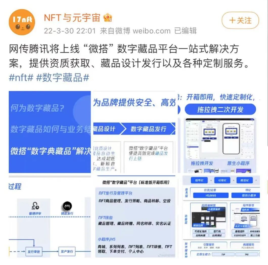 2022年3月,有媒体爆料称腾讯即将上线“微搭”数字藏品一站式服务平台,为客户数字藏品搭建一站式服务,产品包含NFT发行及管理平台、NFT钱包以及小程序/H5等,提供藏品设计发行以及各种定制服务。