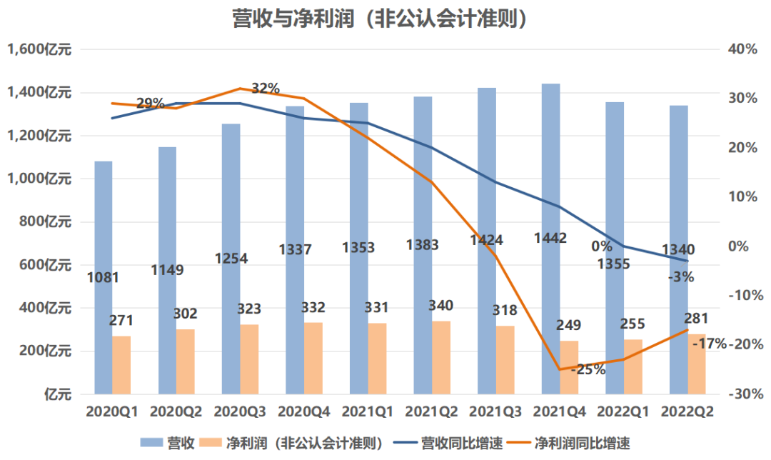 数据显示,第二季度营收1340亿元,同比下降3%,环比下降1%。非国际财务会计报告准则下,净利润281亿元,同比下降17%,环比增长10%。