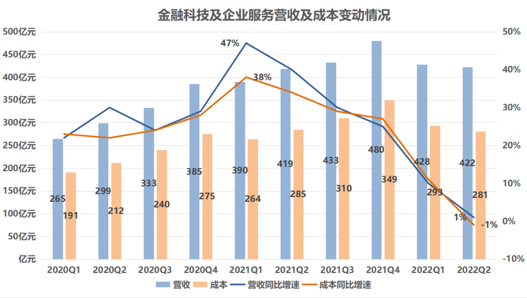 财报显示,2022年第二季度金融科技及企业服务营收422亿元,同比增长1%,占总收入的32%,营收增速较上个季度有所放缓。金融科技及企业服务成本达281亿元,同比下降1%,成本投入首次进入负增长,这反映腾讯的“降本增效”达到了一定效果。