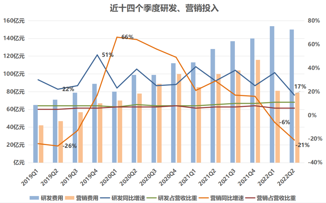 第二季度,腾讯营销投入97亿元,同比下降21%。今年以来,腾讯为了“降本增效”不断削减营销投入。不过,研发投入总体上保持着稳速增长,这似乎在表明腾讯已“慢下来”,开始走技术路线。