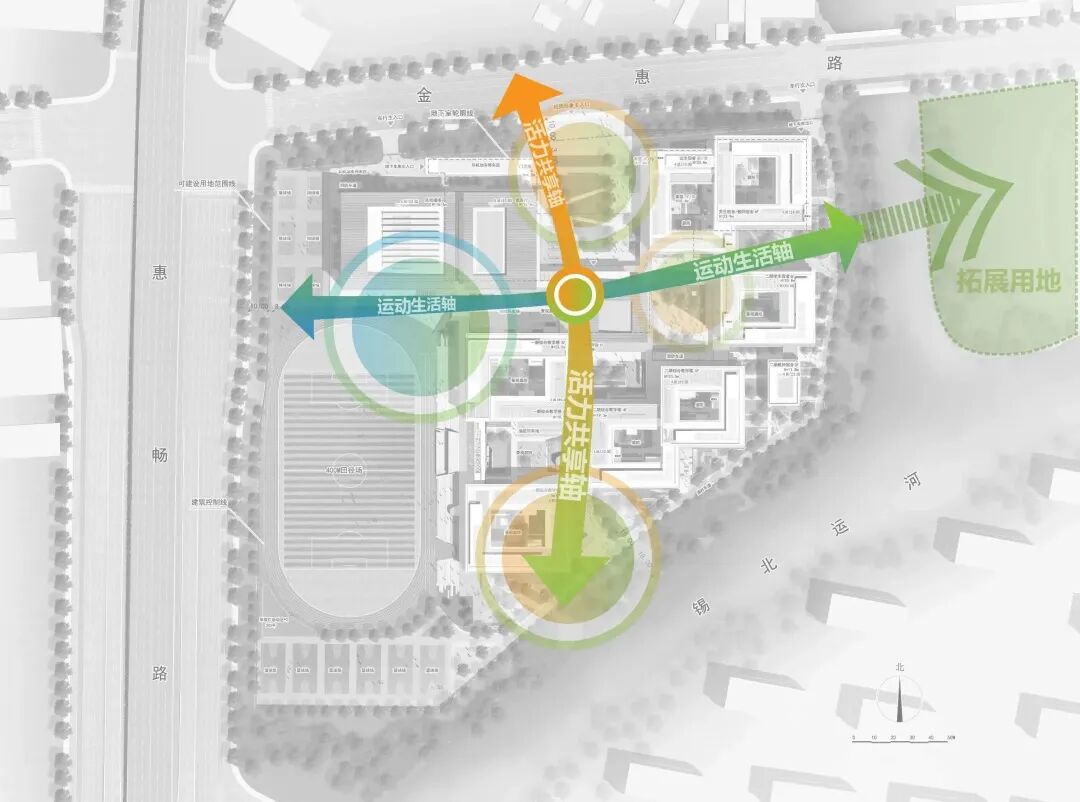 项目用地较为平坦,西侧紧邻城市规划高架路,东南侧临锡北运河,场地条件复杂。面临诸多限制条件,设计需要消解西侧高架路对学校的消极影响,协调处理校园与东南侧城市水系的关系,而最重要的一点,在于解决新建校园给北侧城市道路带来的潮汐性交通拥堵问题。