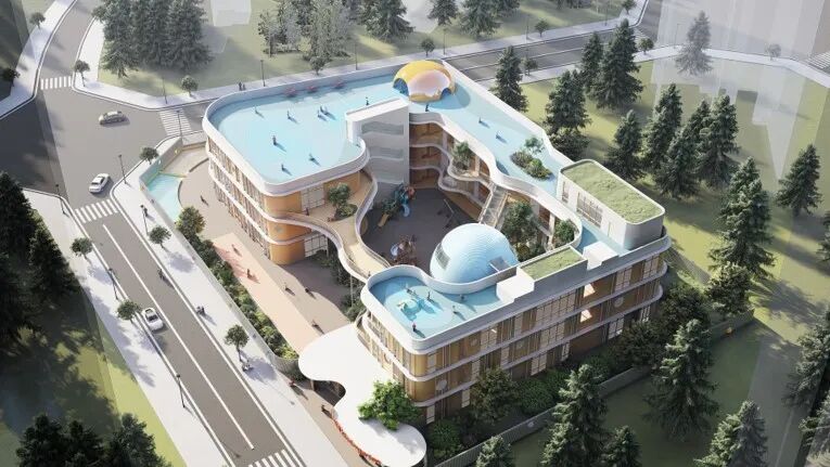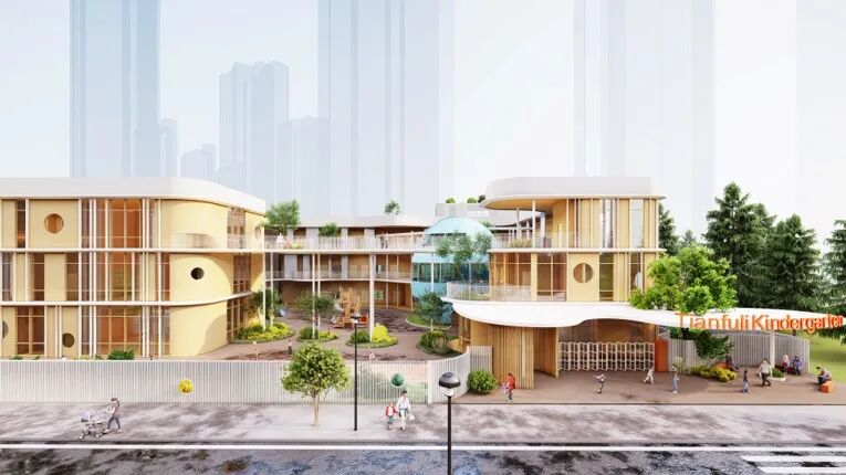 幼儿园建筑形态以自由曲线构成退阶式平台,并会设置绿植空间,让孩子与植物一起沐浴阳光、自然生长,营造出一个生态,可持续发展的体验式幼儿园。