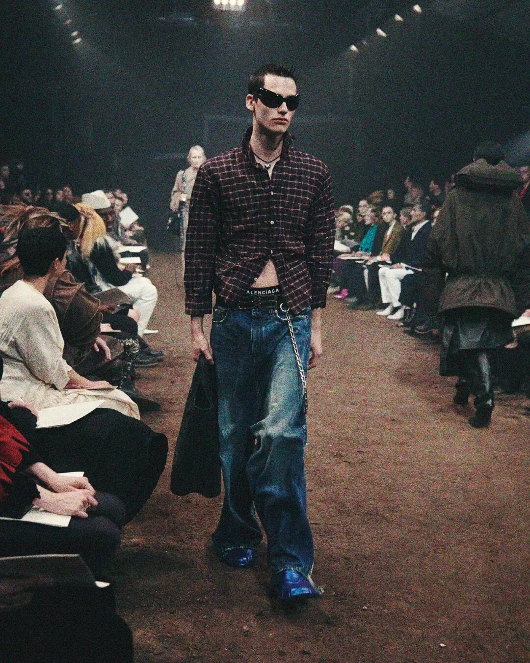 Demna将自己投身于那个“黄金时代”,解构的结构手法、澎湃的潮流趋势、属于青春的荷尔蒙在此时此刻迸发着。低腰喇叭裤、露脐的短上衣、做旧的牛仔面料、带有Post-grunge 风格的剪裁轮廓,都将设计推向了高潮。
