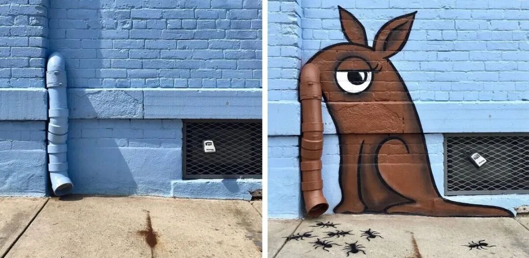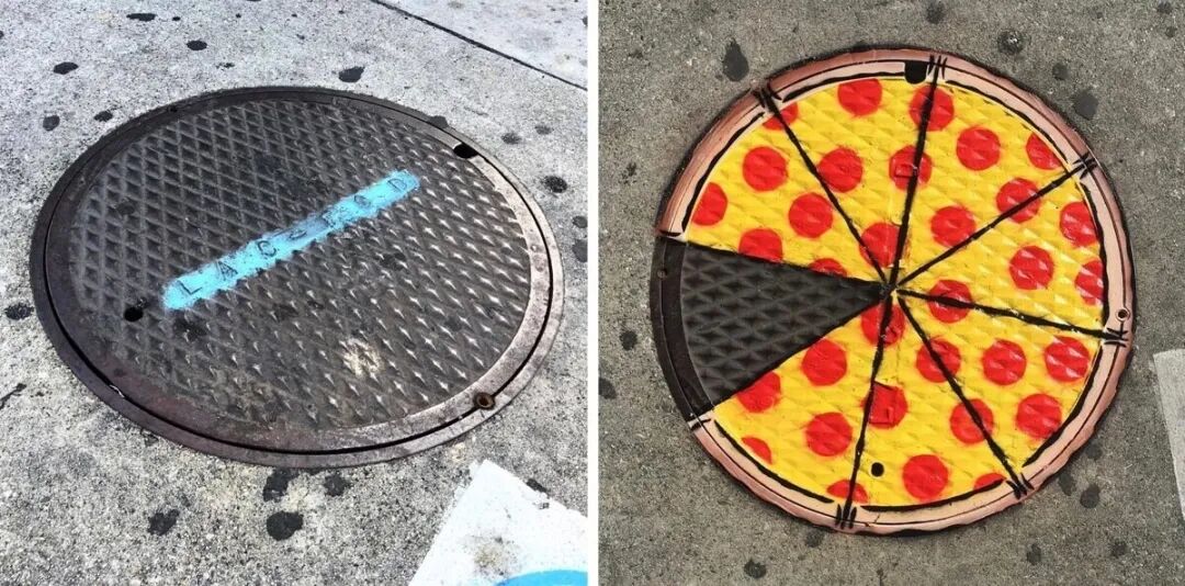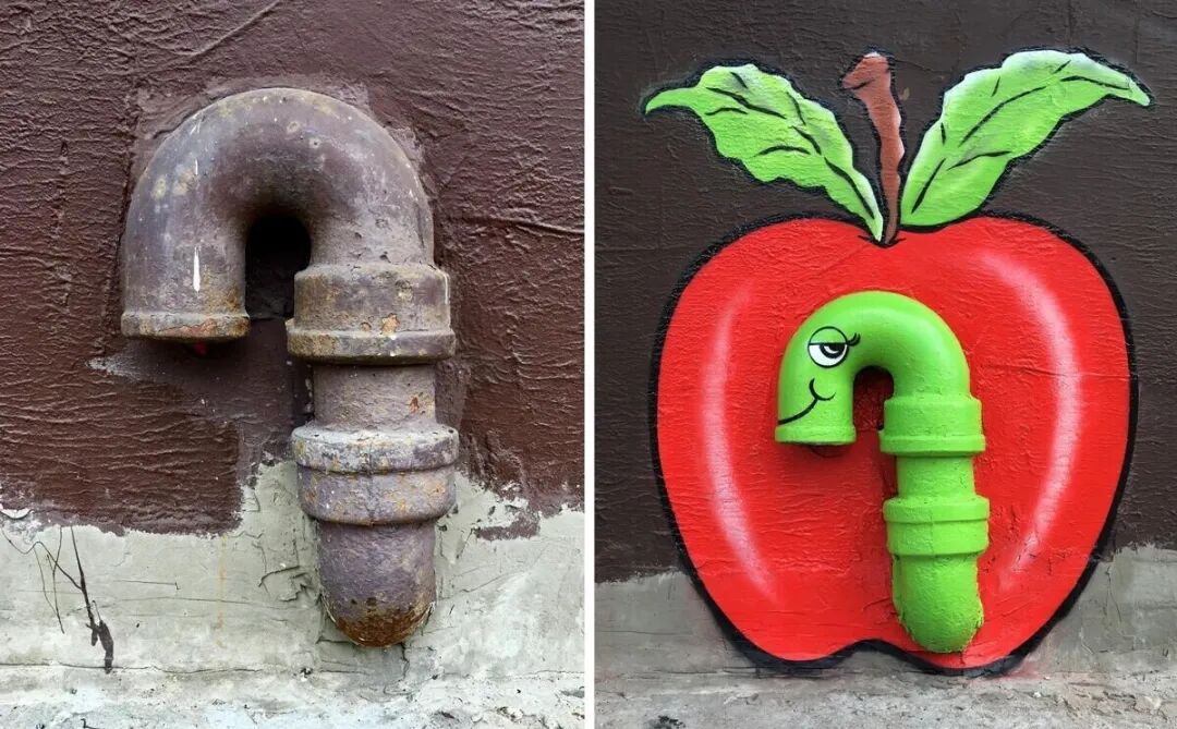 一个圆形的下水道盖子,被他画成了一张诱人的披萨,一段生锈的金属管,被他涂鸦成一只躲在红苹果里面的绿虫子。不得不说,艺术家的想象力真的绝绝子,想象一下,当你走在街头,周围都是这样的卡通场景,是不是上班的脚步都能变得轻盈一些呢?