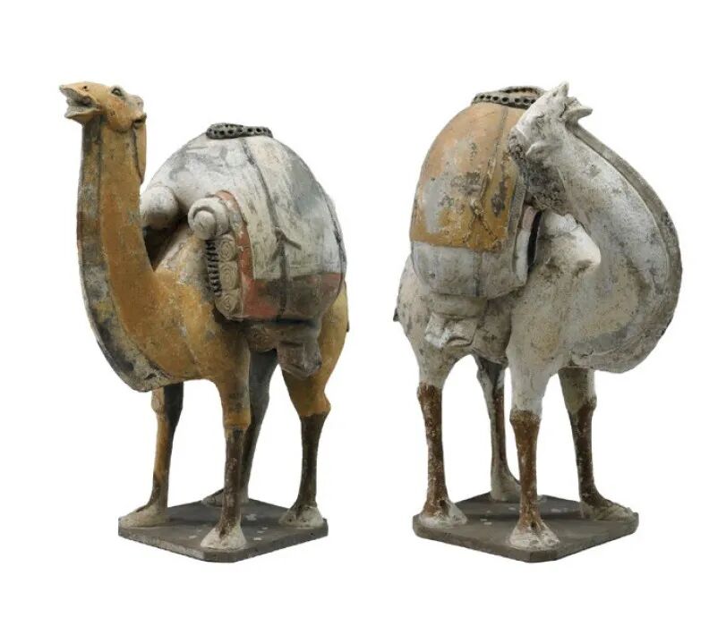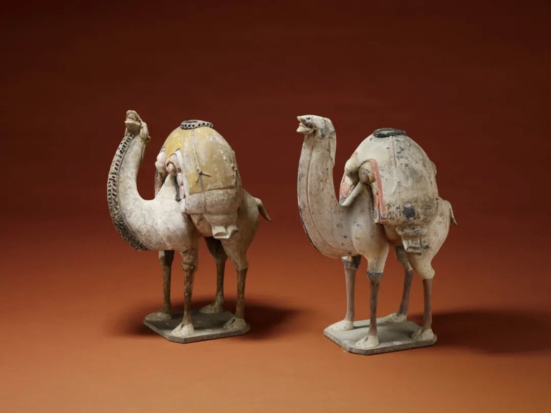 哈佛艺术博物馆藏一对北齐加彩骆驼,不论在造型、尺寸、艺术风格皆与本对骆驼相同,说明它们可能是同时期的作品,而中国国家博物馆藏陶加彩骆驼则向我们揭示这类造型独树一格、强调细足、负重的陶骆驼雕塑,应是反映当时北齐陪都晋阳(今太原)的地域风格。