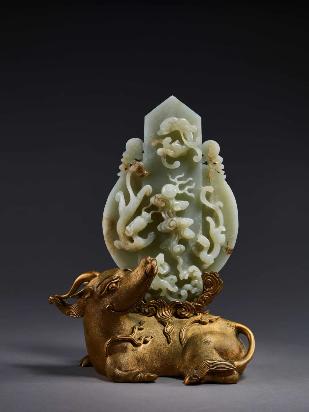 拍品和阗籽料为材,质地温和润泽,宛若凝脂,局部有绺有皮。整体画面是以传统的玉圭与玉璧结合而成。正面雕有苍龙教子的题材,底部饰有江崖海水纹。这代表了皇位父子传承的重要意涵。背面浅浮雕嘉禾图,意指皇帝圣明,天降祥瑞之寓意。底座为铜鎏金瑞兽,伏坐于地,回首相望之姿。