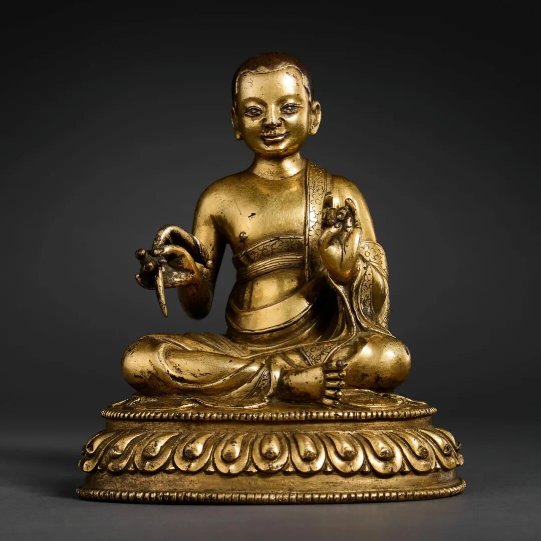此伐那婆斯尊者宽额丰颐,双眼炯炯有神,目视前方,嘴角微哂,神情慈悲且坚定。此像遵循印度学僧Śākyaśrībhadra(1127-1225)所著的《尊者礼供和仪轨略摄》,左手施期克印,右手持拂麈,坐于覆莲座上,仪态庄严,令人敬重,是件精致华美的明代中期藏地造像。