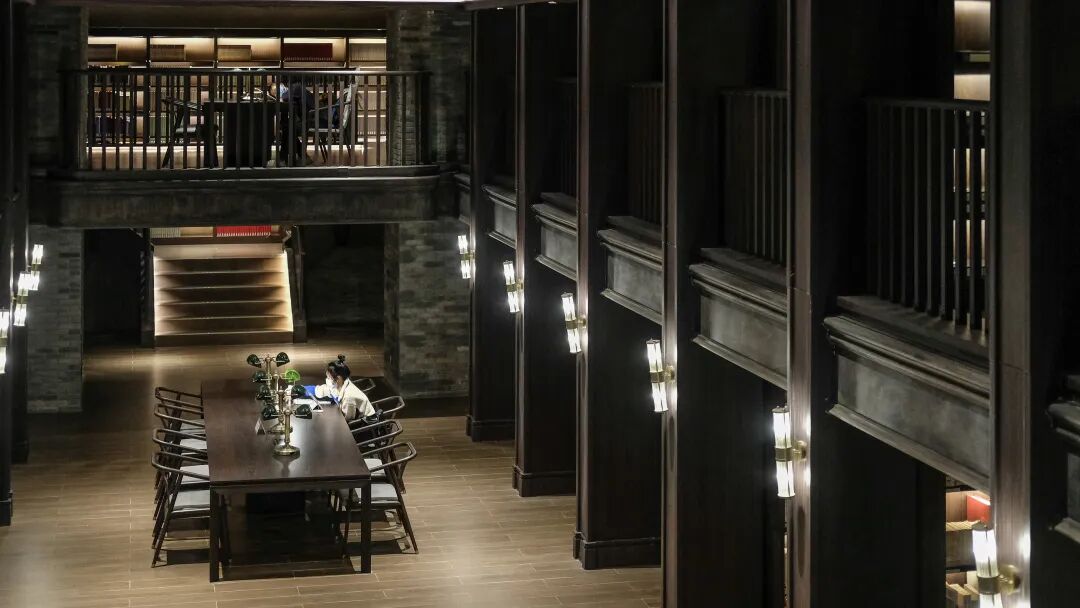 如果来打卡天府人文艺术图书馆,那么一定不能错过负一楼的成都文献馆。古朴静谧的设计风格,融合了古代藏书楼与爱尔兰都柏林图书馆的设计理念,楠木搭建的两层高阁楼里,昏黄的灯光,恍若穿越时空,可以循着老成都的文脉,走入浩瀚悠久的历史人文故事中。