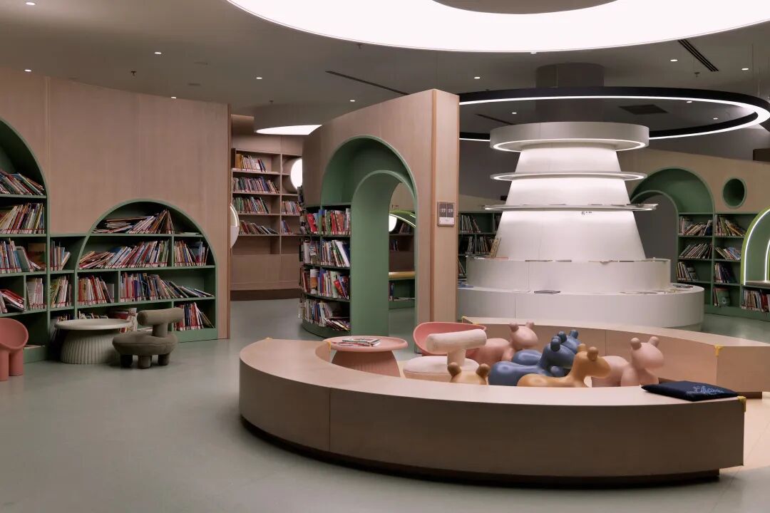 卡通熊猫形状的书立、矮萌的智能借书机、花瓣形状的亲子阅读区共同打造了充满童趣治愈的空间。在这里,父母陪着孩子进入一个个梦幻治愈的绘本世界里,留下甜蜜又珍贵的记忆。