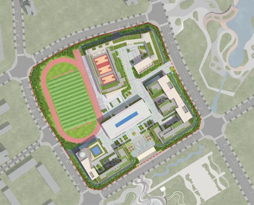 华阳中学(香山校区)方案在设计时结合公园城市理念,将学校的功能分区、交通组织等结合周边的城市规划、环境等情况进行总体布局。