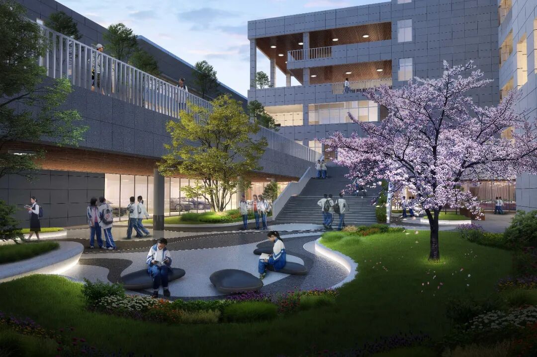 学校以“四季书山,多彩校园”为设计理念,打造出文化宜心、环境宜心的现代校园,具有城市融合、“书香气”氛围营造、空间环境辅助教学创新三个特点。