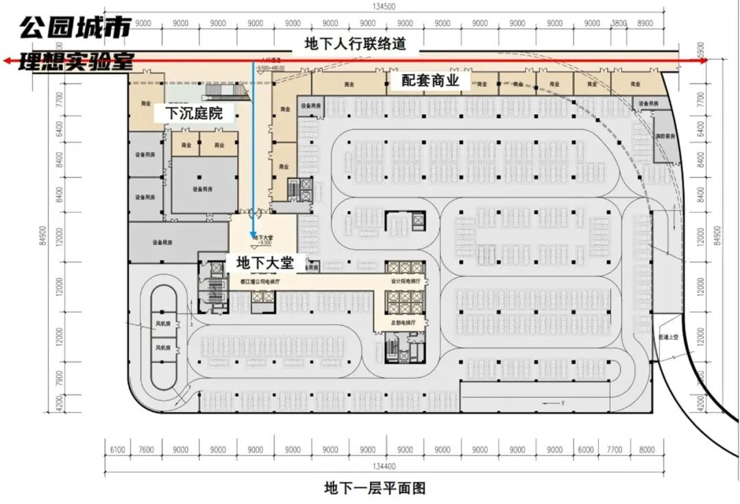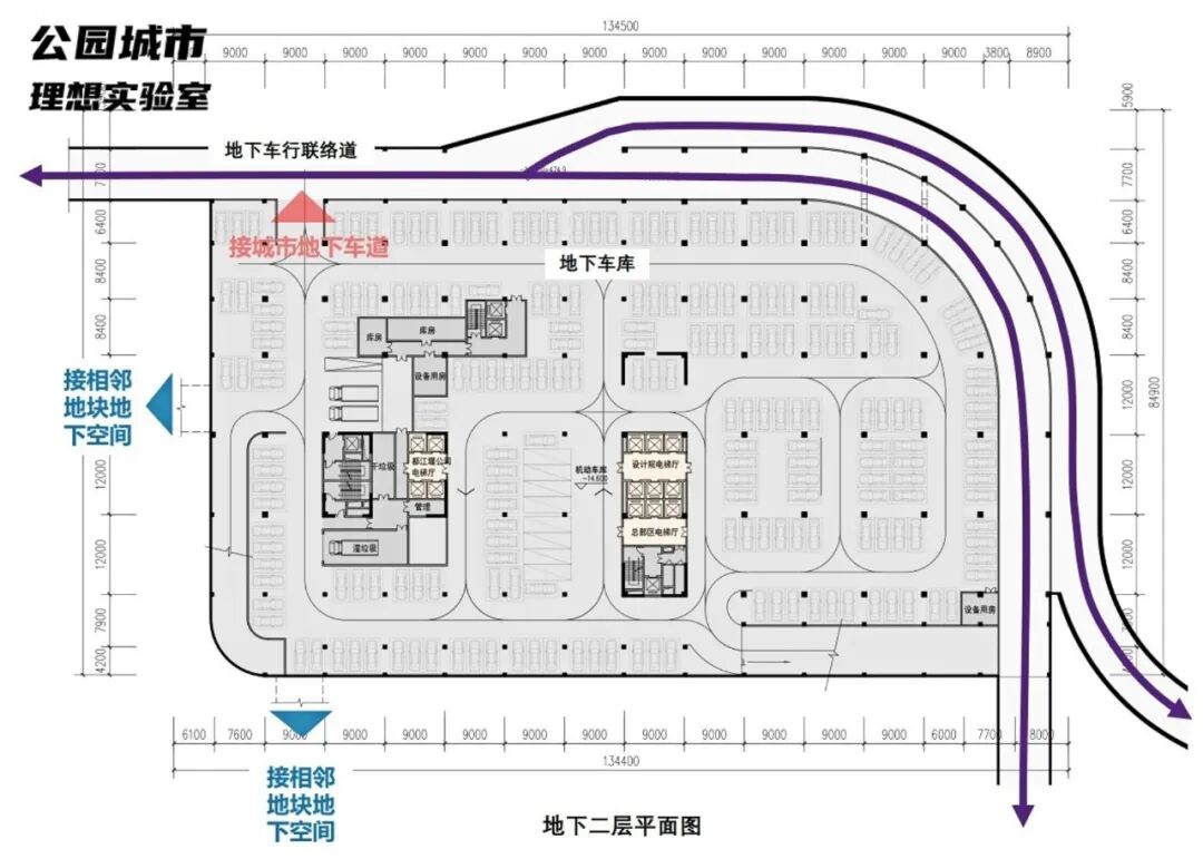 地下二层则主要用作地下车库,设计方案沿地块设置逆时针车行环道,地面车流通过城市下穿道进入地下二层车行联络道,保证了地块整体通行效率。