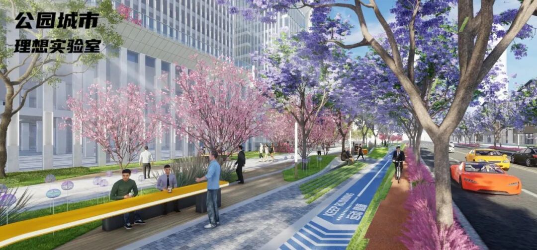 以市政绿地隔离车行道、人行道和非机动车道,结合阳光草坪与植物景观打造景观绿化区,连通人行广场与木制休闲平台,打造出舒适、活力的城市慢行街道空间。