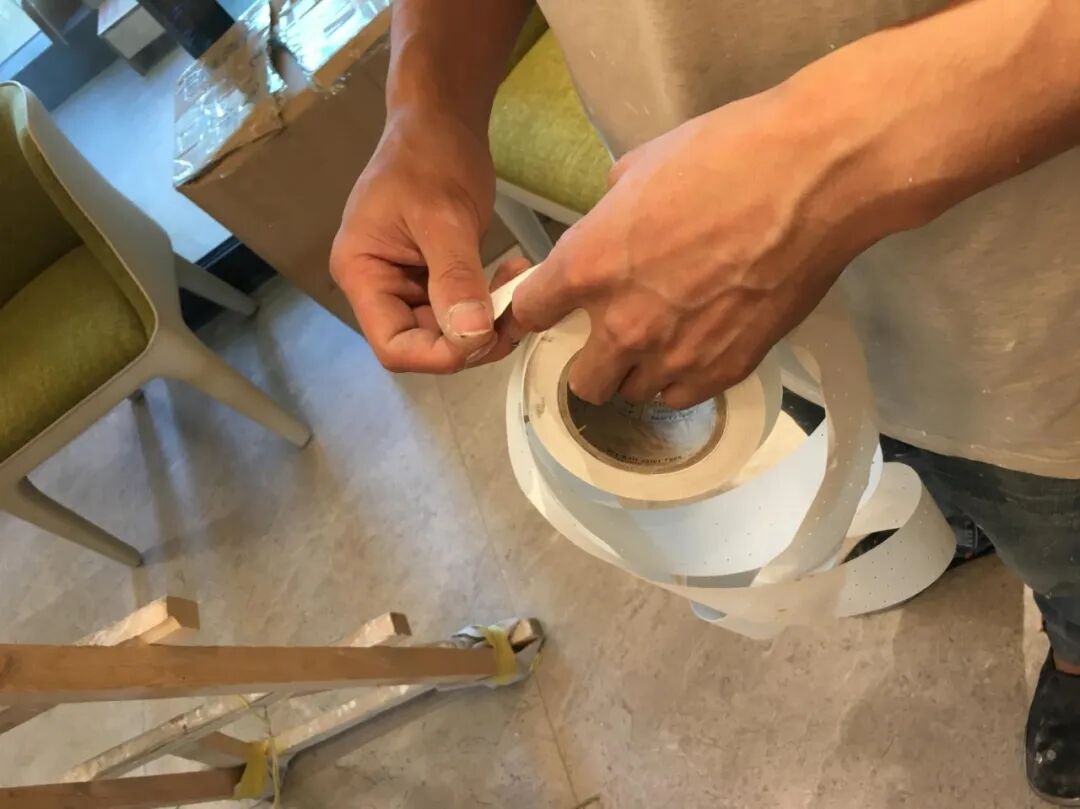 d、再用腻子抹平缝隙,缝隙处贴上接缝纸,用腻子抹平,等腻子干了之后,再刷乳胶漆,打磨一下就可以了