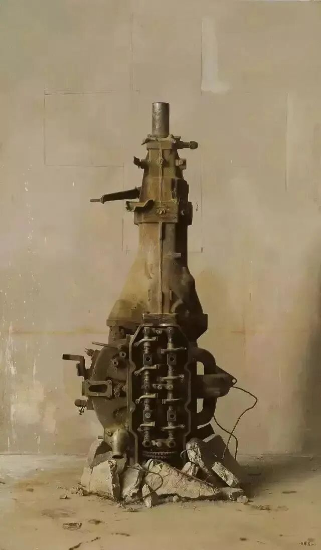 冷军不是在超然地、客观地、超写实地描绘一架机器,而是用超写实的手法塑造一个象征物。他从浩浩荡荡的时代浪潮里,慧眼独具地选择了工业化的一个“典型”:动能装置。《丰碑》是时代之子。冷军是怀着一腔赤子之情来创作《丰碑》的,是怀着“立此存照”、“为时代立传”的理想来创作《丰碑》的。