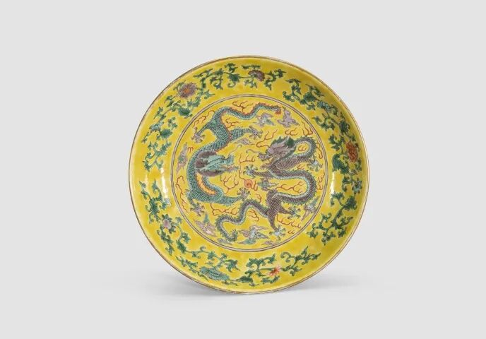 【说明】:整件器物通体以黄色为地,口沿下饰松石地如意云纹,长颈绘制云蝠纹,中间腰线绘西番莲和寿字纹,缠枝莲绵连不断,蜿蜒精美兆寓福寿万年,代代绵延的吉祥寓意。腹部绘九桃团寿如意纹寓意长寿万福,腹部三开光绘制龙凤戏珠图,龙爪坚实有力,凤羽造型别致,底部书“大清乾隆年制”六字篆书印章款。器型规整硕大,周身满工,画片精美,龙凤呈祥,寓意美好,并具有很好的装饰效果。