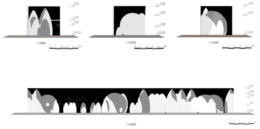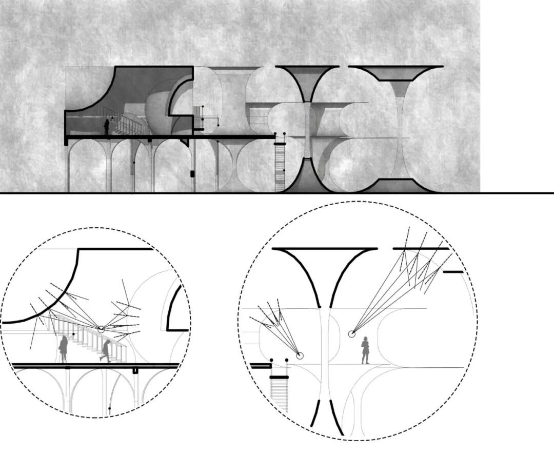 从场地中原有的诸多文博公共场所中,提取出源自古典建筑的拱廊和拱券等重要元素,而这也恰是前面乐器发声原理、乐曲转译和建筑语汇确立阶段提取出的,本方案设计了一个声音艺术馆,将传统的拱券和拱廊进行抽象和变形,在此基础上寻求空间和功能的联系。创造了三种不同的空间:由城市博物馆轴线限定的底层拱廊空间;,其内部形成众多凹面的球拱空间,使得空间中所产生的声音充满变化;串联上下层的伞拱空间,它形成的高大的凸面空间使得声音易于集中,氛围肃穆,提供驻足凝思的冥想空间。