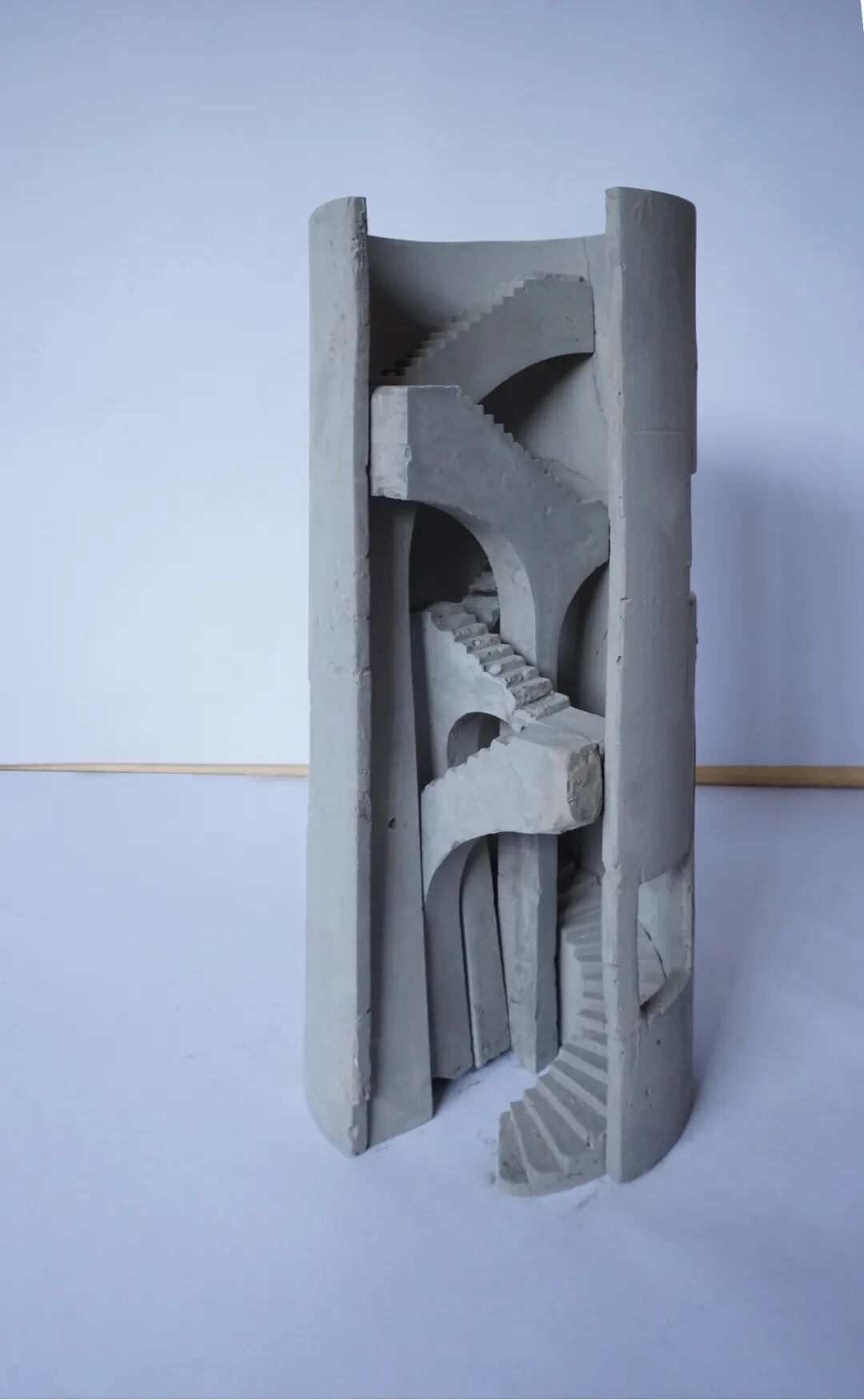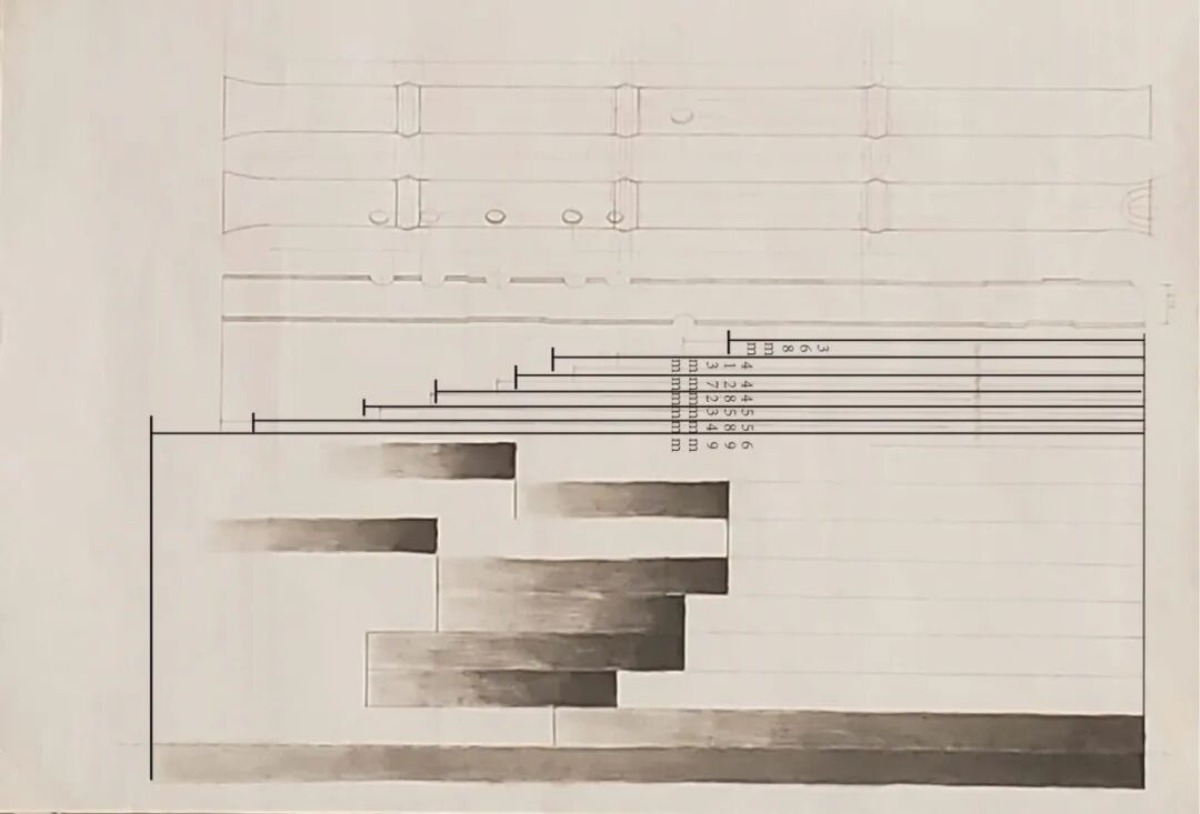 本次设计,以“洞箫“为研究对象切入,对于洞箫发声过程中管腔内气柱变化为研究对象。把发”12 3 4 5 6 7“声时气柱气压的变化,转化成实体。并按照《梅花三弄》的谱子进行排列。得到一个原型后,再进行正负形的转化,将空气柱转化为负型。并结合Kassel场地对于二战的分析,设计成一个战争反思纪念亭,从而达到在战争中殒命的无辜平民的反思。