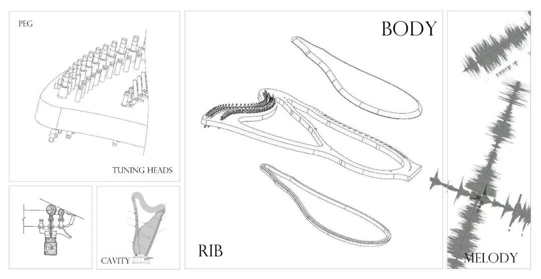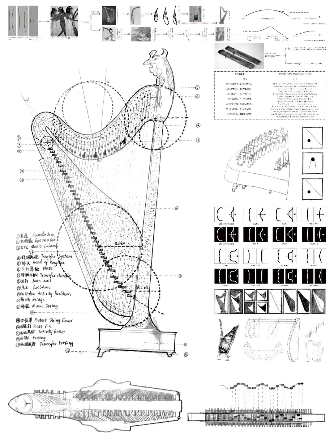 Explore the pronunciation and structural nature of the ancientinstrument Konghou, and try to visualize the sound of konghou through digital researchand simulation research. By combining the presentation of sound with thehistory of kassel, a slope containing the remains of wwii buildings was chosenas the base of the building to create the World War II surviving architectureMemorial. Designed to remind people that while the war undermined the city'sself-confidence, it also brought splendid contradictions, and Kassel became aart of ruined history, obstinacy and hope, imperfections that produced not onlyloss but also a fascinating story of city-building.