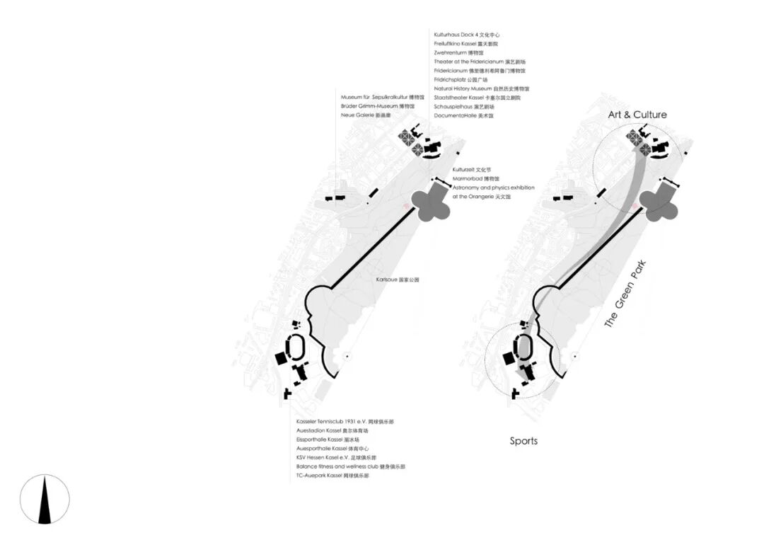 卡塞尔的城市尺度比秦皇岛要小,通过不同高度的瞭望塔可以直观的观察到历史建筑,所以建筑更为开放。秦皇岛有部分的城市景观因为楼的遮挡是不可见的。所以除了取景框以外还增加了该景观的介绍和展示。