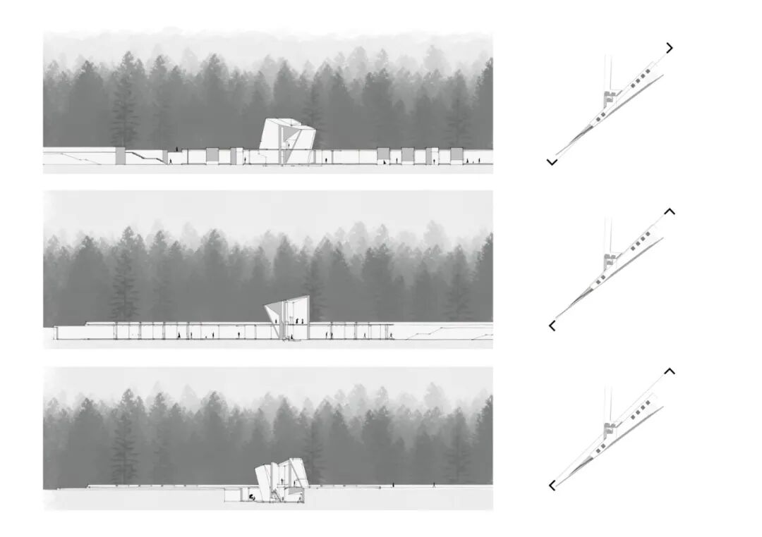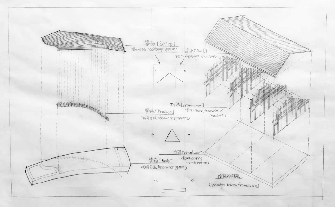 "The zither is round like the sky onthe top and flat like the ground on the bottom. It is hollow and accurate. Ithas six harmony strings and twelve columns. It is intended to last twelvemonths. It is also a tool of human intelligence." Guzheng is one of theancient plucked instruments in China. It was formed and spread in the QinDynasty and prevailed in the Sui and Tang Dynasties. Gao Shan Shui Liu, one ofChina's ten ancient songs, has condensed the essence of China's ancient cultureand ancient music. Based on this ancient music, this design transformsdifferent playing skills and pronunciation methods into architecturalvocabulary, extracts the intention of mountain and water, and creates twoplaces for meditation and looking back in combination with the differentcultural backgrounds and site characteristics of Kassel and Qinhuangdao.