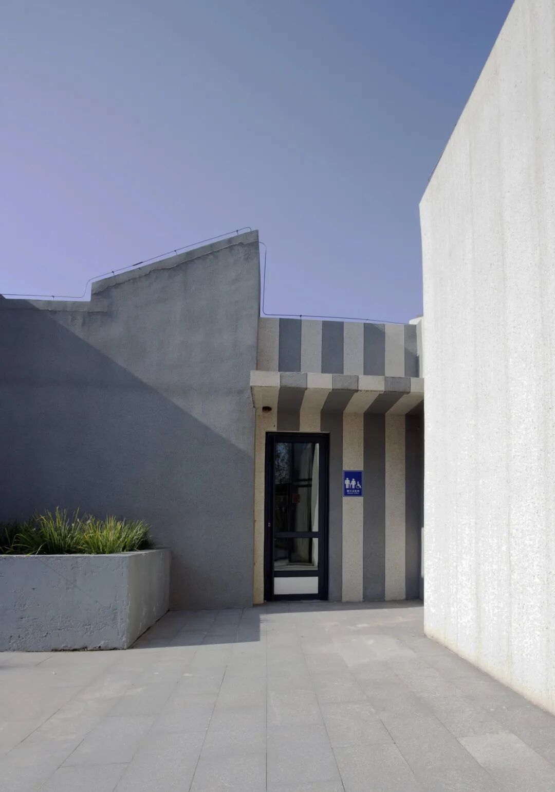 1.The building facade uses no color paint. The men’s lavatory uses gray paint to symbolize the male’s "roughness"; the female lavatory uses white paint to symbolize the female’s "purity". The family lavatory is located between the male and female lavatory and is treated with stripes of gray and white paint. It symbolizes that the family is consists of men and women. The entrance to the men’s bathroom is solid, with only a glass flat door, which symbolizes the “closed” inner world of men, while the entrance of the women’s bathroom is a glass box, transparent and bright, symbolizing the “open” inner world of women.
