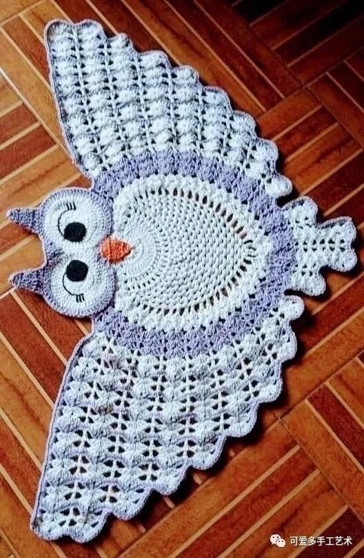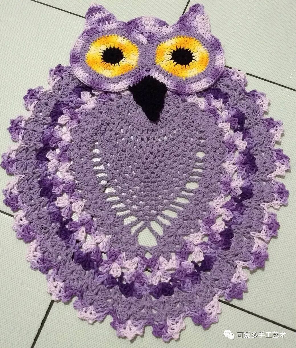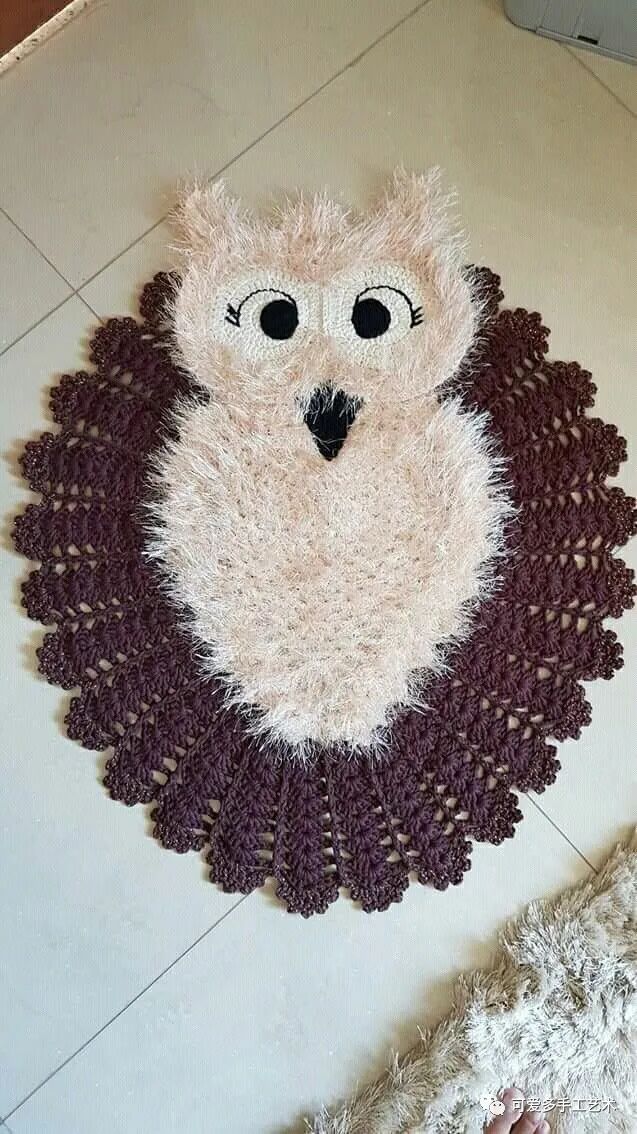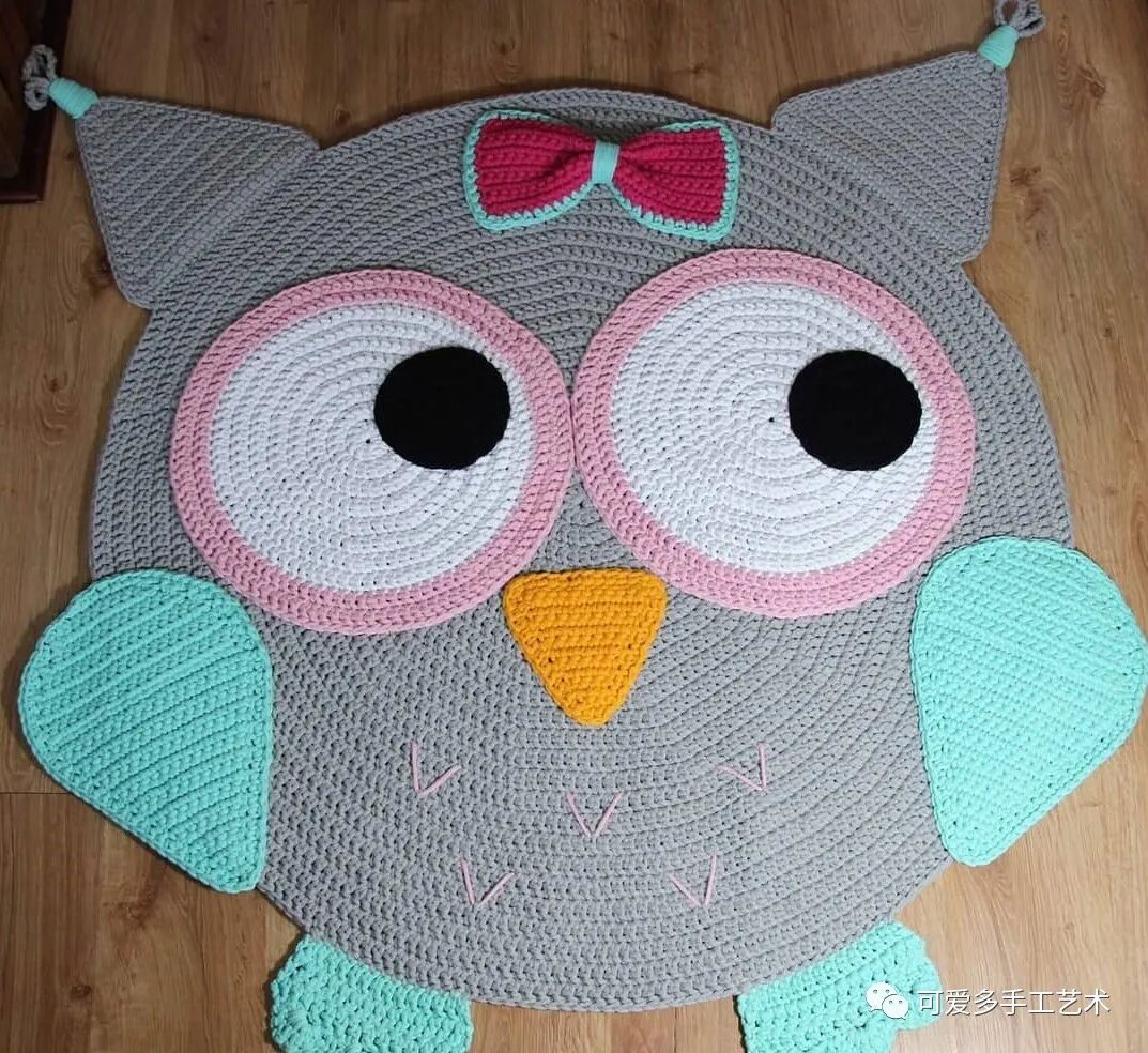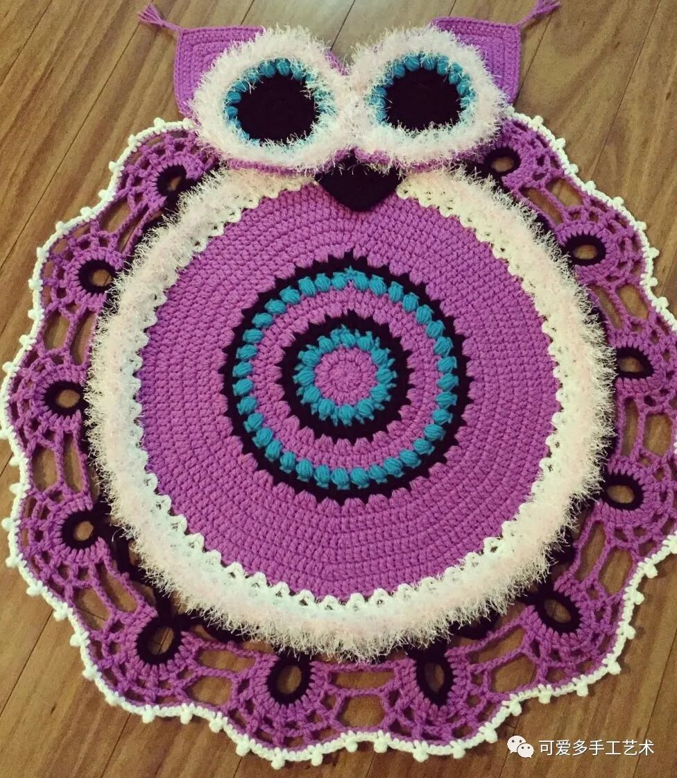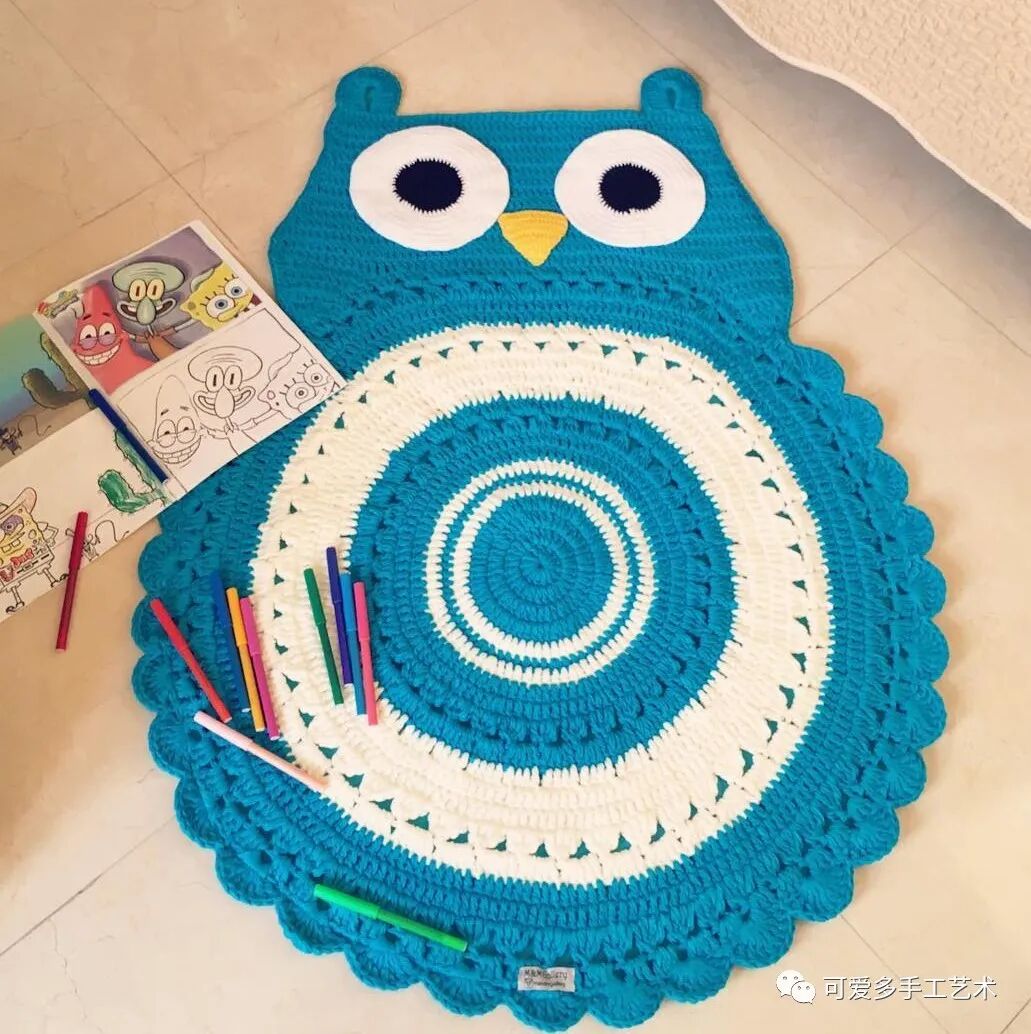 天冷时,地板都觉凉,钩几张大大的地垫放地板上可以随时活动,既华丽又温暖,放在哪个位置都适合,钩小一点还能做餐垫坐垫甚至做成装饰花片缝在包包或衣服上。超可爱的猫头鹰图案,各种百变的造型,自己动手钩几张,全家都享受。