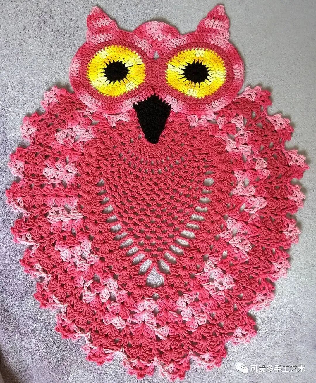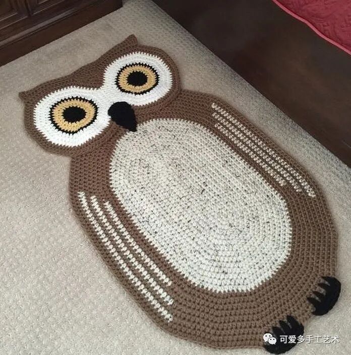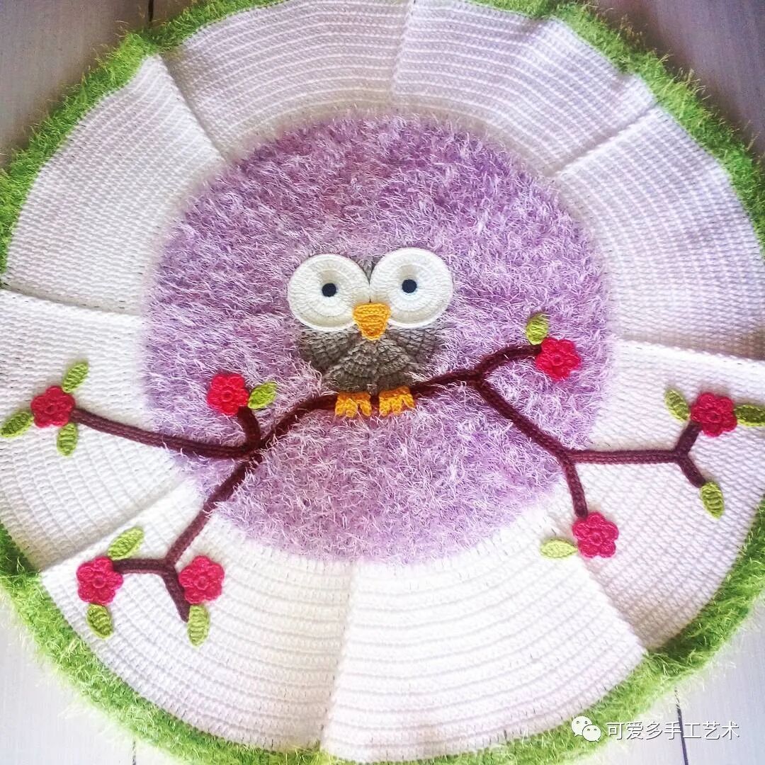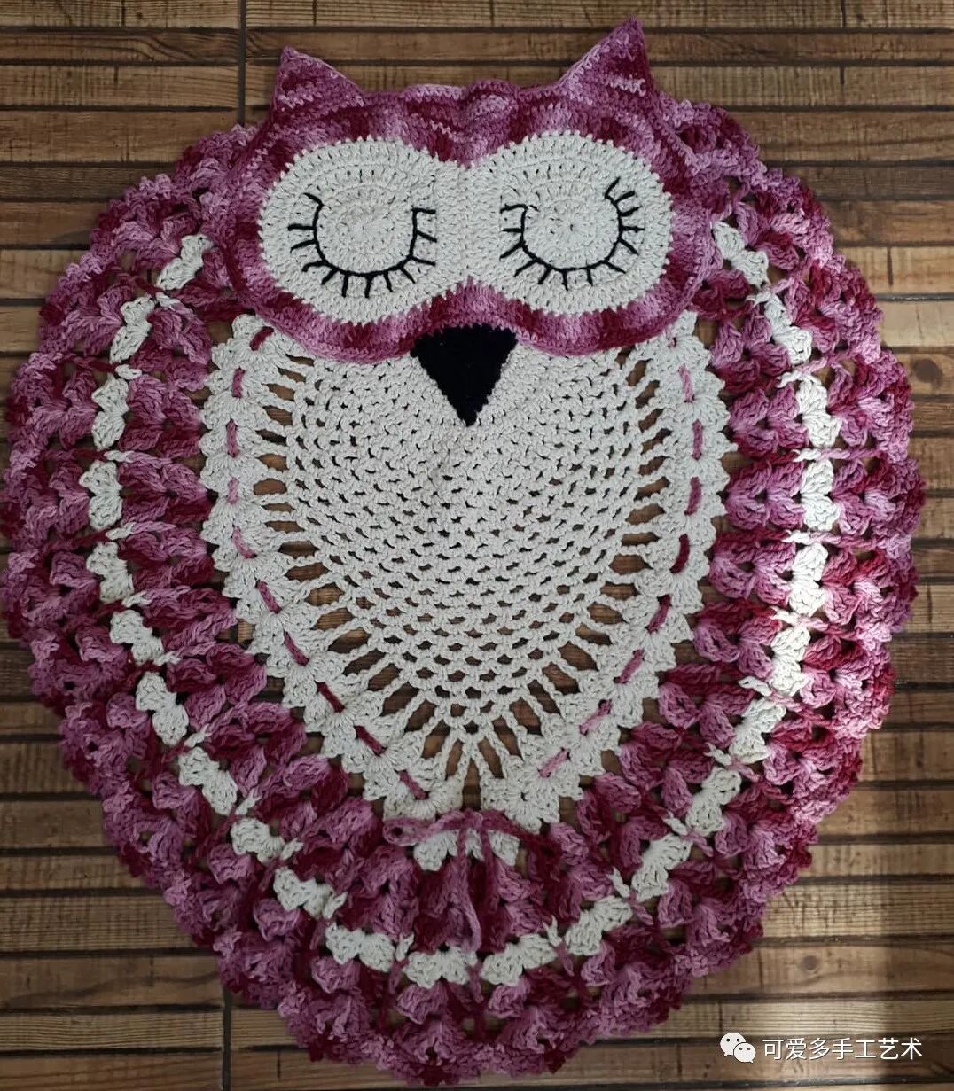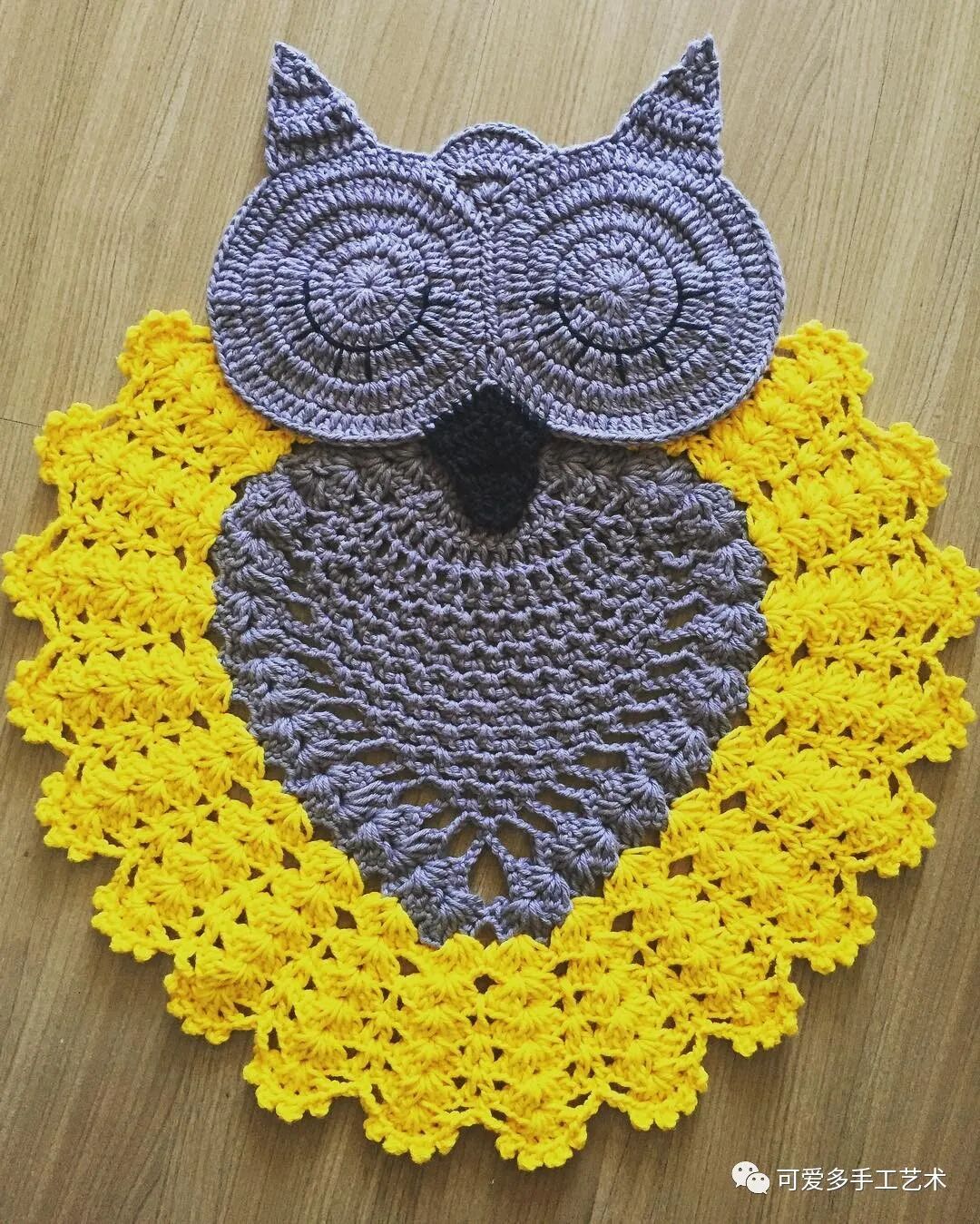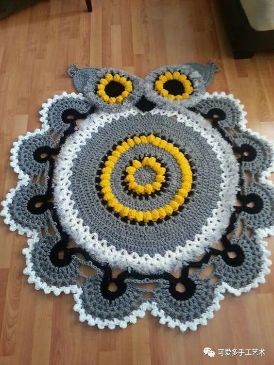 天冷时,地板都觉凉,钩几张大大的地垫放地板上可以随时活动,既华丽又温暖,放在哪个位置都适合,钩小一点还能做餐垫坐垫甚至做成装饰花片缝在包包或衣服上。超可爱的猫头鹰图案,各种百变的造型,自己动手钩几张,全家都享受。