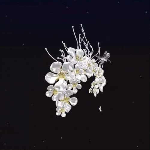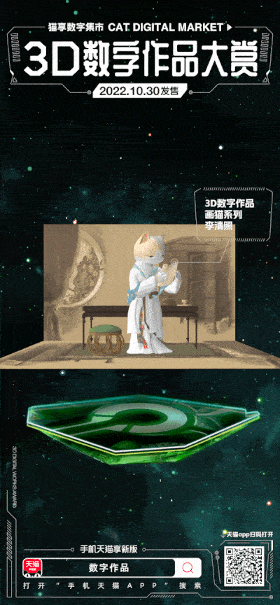 虚拟文玩部分则有画猫系列的完整创意呈现,将历朝的名人轶事、民生民俗与现代数字化相结合,打造生动可爱的“画猫”形象,在观众心中丰富了苏东坡、朱淑真等文人故事。千宫幻景以新中式风格结合蓬莱、瀛洲和方丈三座仙岛上的不同植物,采用金属与玉石的材质、高饱和度色彩,展现出飘忽的玻璃质感,重新演绎超现实的古代风物。