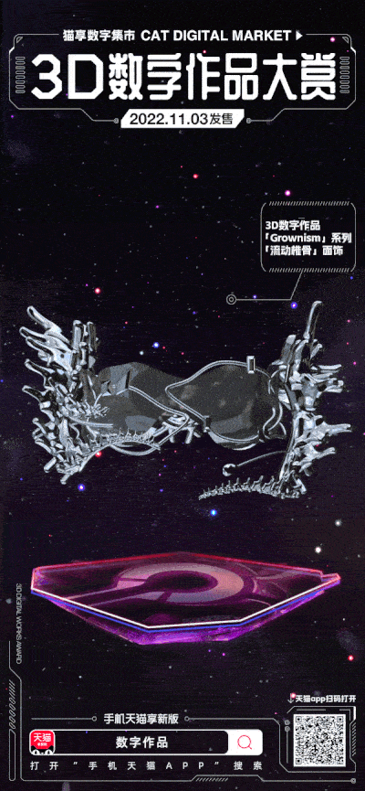 而近几年,我国的大小品牌也在近几年跟上潮流趋势,尝试着各种各样的数字技术,开发数字作品是较为流行的一种方式。其中,10月27日发布手机天猫「享新版」,开启3D购物模式,上线数字作品商品,同时还有3D逛街看品牌产品、线上VR看展与沉浸式3D视听等功能,丰富虚拟购物新体验。