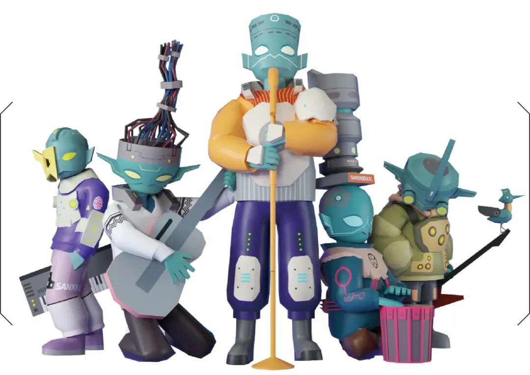 而数字作品“星乐寻踪”则体现出构想性、多感知性、沉浸感和交互性四个技术特征。灵感来自于三星堆文物,采用磨砂材料质感,放大原本三星堆文物具有的夸张变形造型,强化五官,融入了潮流衣着与机械元素,同时考虑到儿童对于色彩的感知更为敏感,采用高饱和度色彩吸引着小朋友,老少皆宜。