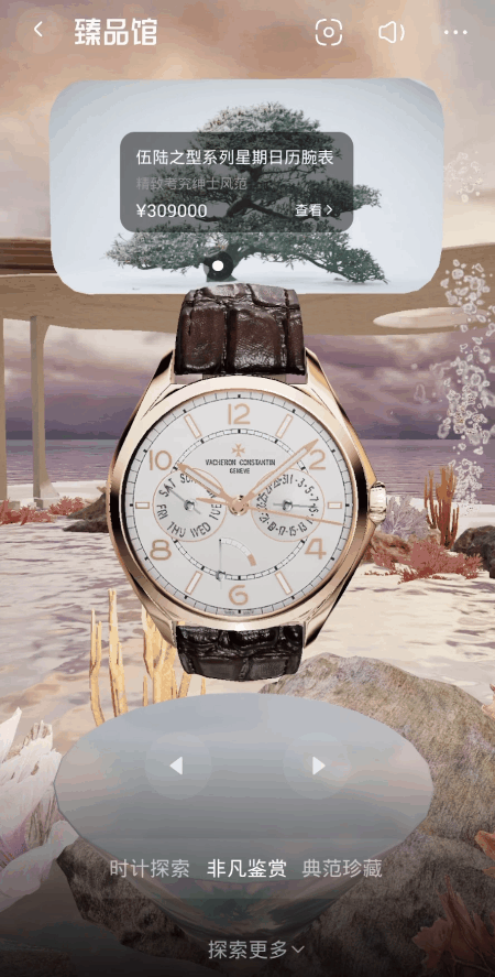 还突破了传统认知中的虚拟与现实界限,将江诗丹顿的八款经典腕表都经过全方位精细建模,不仅外表上与线下实体店所见的产品一模一样,用户还可以点击产品还可深入了解品牌故事与内涵。