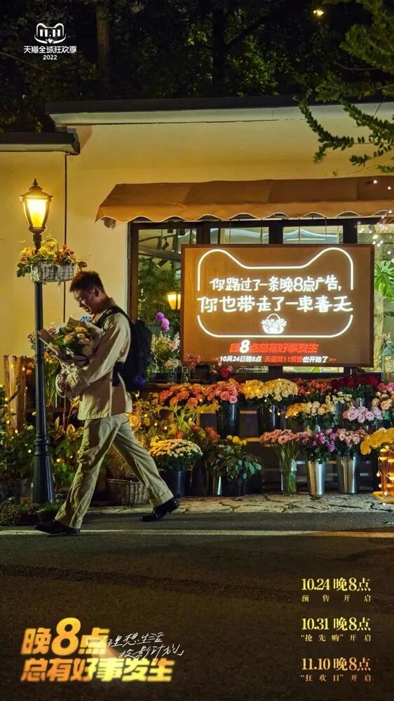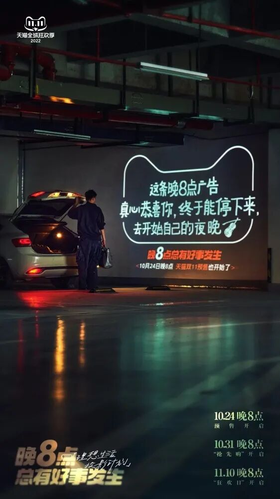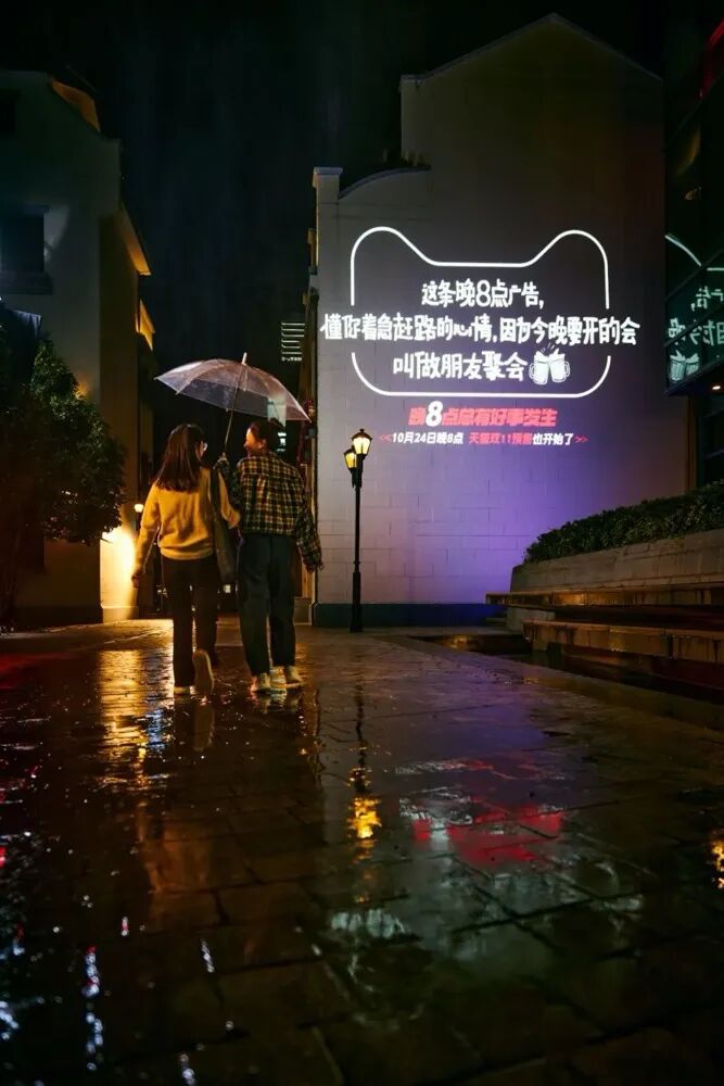 今年双11,天猫呈现了不一样的品牌表达。用一台移动投影机,把晚8点的文案写在了花店、阳台、夜宵摊、停车场、江边的跑道上。