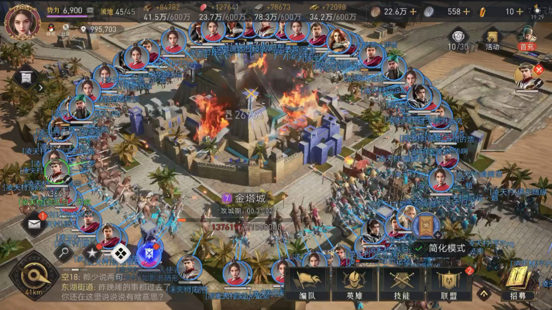 在这种情况下,同为SLG的《重返帝国》却显得有些不太一样。它不仅采用了操作量更高的自由行军设计,还引入了“千人同屏,万人观战”的攻城战设计,似乎完全不用担心大地图的优化问题。