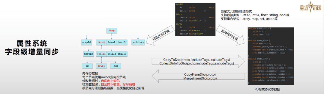 《重返帝国》属性系统主要具有以下特点:第一个是字段级增量同步,也就是当属性发生变化时,服务器只会向客户端同步变化数据。第二个是按需同步,即服务器向客户端同步的所有属性都是客户端当前需要的,客户端不需要的,不会同步。第三个是零开发成本,就是我们这套属性同步系统是自动完成的,不需要任何额外的开发。