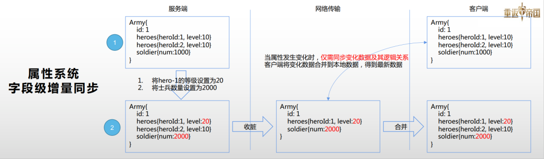 我们先聊聊字段级增量同步。上图是一个示例,假设服务器和客户端在1时刻都有一个Army对象,它的属性是一致的。因为某些原因,服务器将hero-1的等级设置成20,将士兵数量设置成2000,我们该怎么将这个变化数据同步给客户端呢?