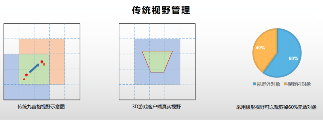 “九宫格”算法的第二个缺点是流量浪费。为了让玩家在格子的边缘能有完整的视野,客户端的可见区域不能大于4个格子的范围。并且在3D游戏里面,玩家真正的可见区域其实是一个梯形,比4个格子的范围更小。梯形范围外的同步对象,玩家是看不到的。通过面积来测算,我们也可以看到至少会有60%的同步对象客户端是看不到的。既然这些对象看不到,我们为什么要进行同步?
