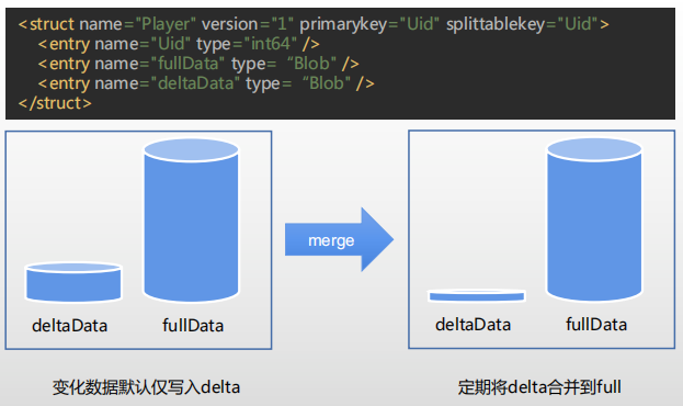 当deltaData达到一定大小或者是达到一定条件时,我们会把它合并到全量数据。我们去拉取这个玩家数据的时候,也在同时拉取他的fullData和deltaData,然后我们会根据fullData创建一个内存对象,再将deltaData合并进来,从而获得最新的数据。通过这种方式,我们的本质就是自动分离了热点数据和非热点数据。