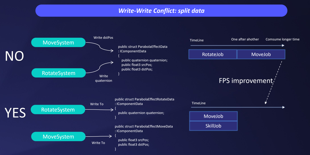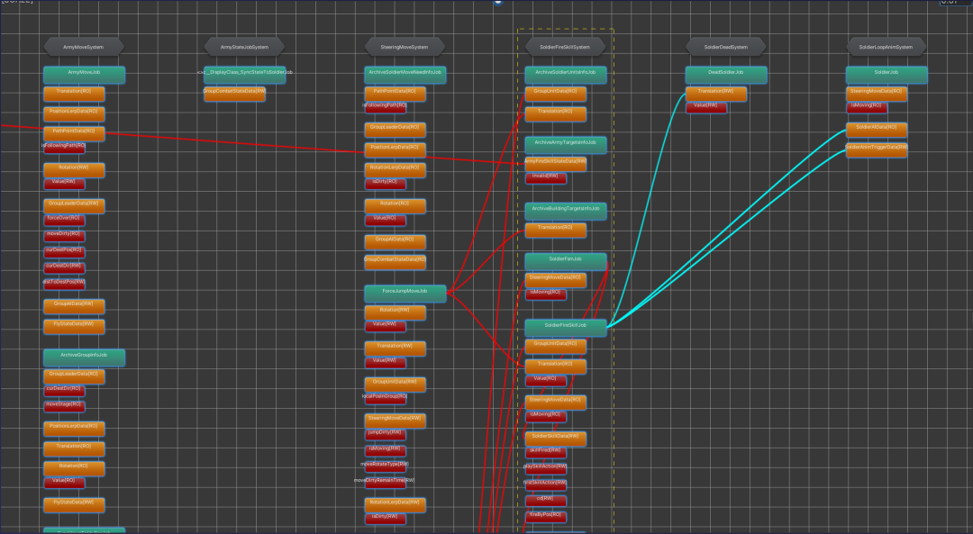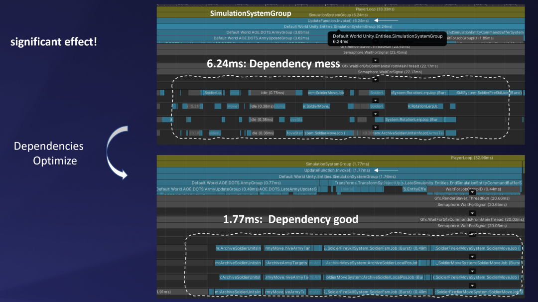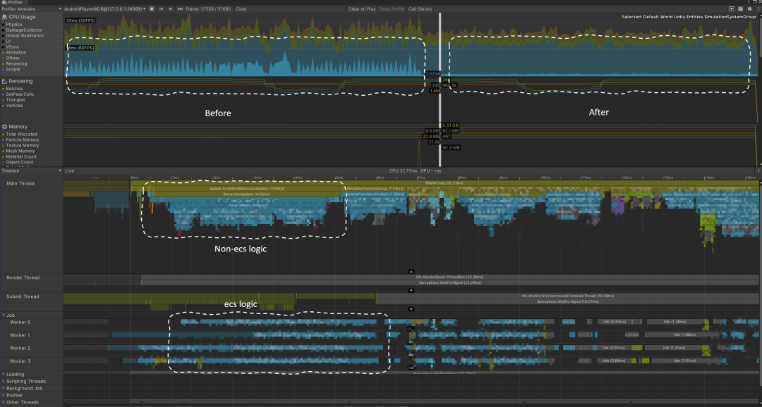 之后,我们还将System按照功能进一步的细化拆分,把一部分Job的执行提前到与非ECS代码逻辑并行,进一步从整体上提高了我们的游戏帧率。