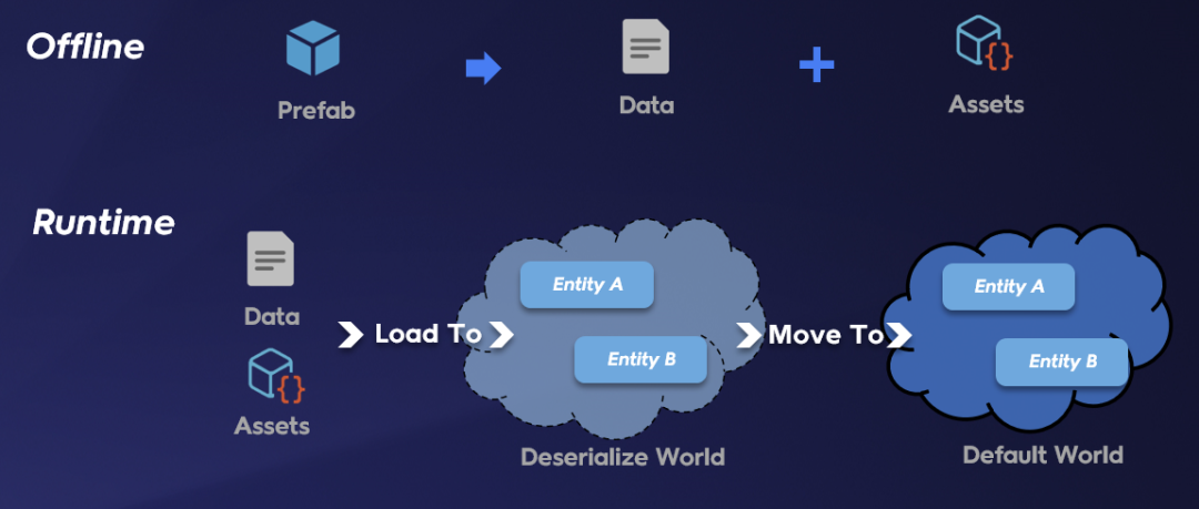 当entity生成好后,我们再把它们移入default world进行运行。这样我们既可以在资产制作阶段使用我们熟悉的prefab,也可以减少运行时的转换时间。