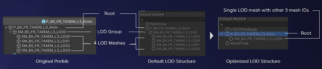 同时,我们也将LOD Group节点和Root节点进行了合并,Entity的数量也从原来的6个下降到2个,性能也有了提升。
