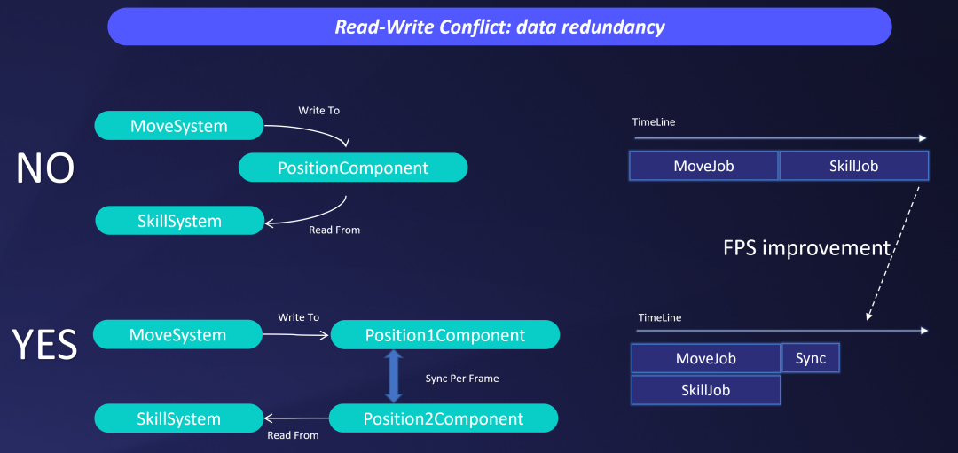 为此,我们专门开发了静态分析工具辅助我们找出System之间的读写冲突与依赖,通过数据拆分、数据备份来解决冲突,让耗时较高的Job能够并行。