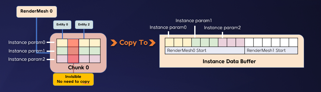 在渲染运行时,我们根据entities的数量预先分配一块大的缓存,之后利用多线程把各个可见的entity的InstanceParam数据复制到Buffer中的指定位置。最后将整个缓存直接提交至GPU,我们就可以按照传统的GPU Instance方式来使用缓存中的数据了。